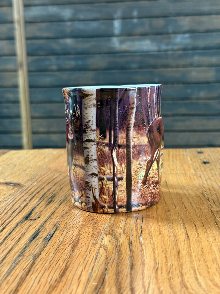 This deer scene 3D ceramic mug by River's Edge Products is ideal for any outdoor enthusiast. It features a three-dimensional design of a deer in a forest that wraps completely around the mug. Its impressive artwork extends to the hand painted handle sculpted to resemble antlers.