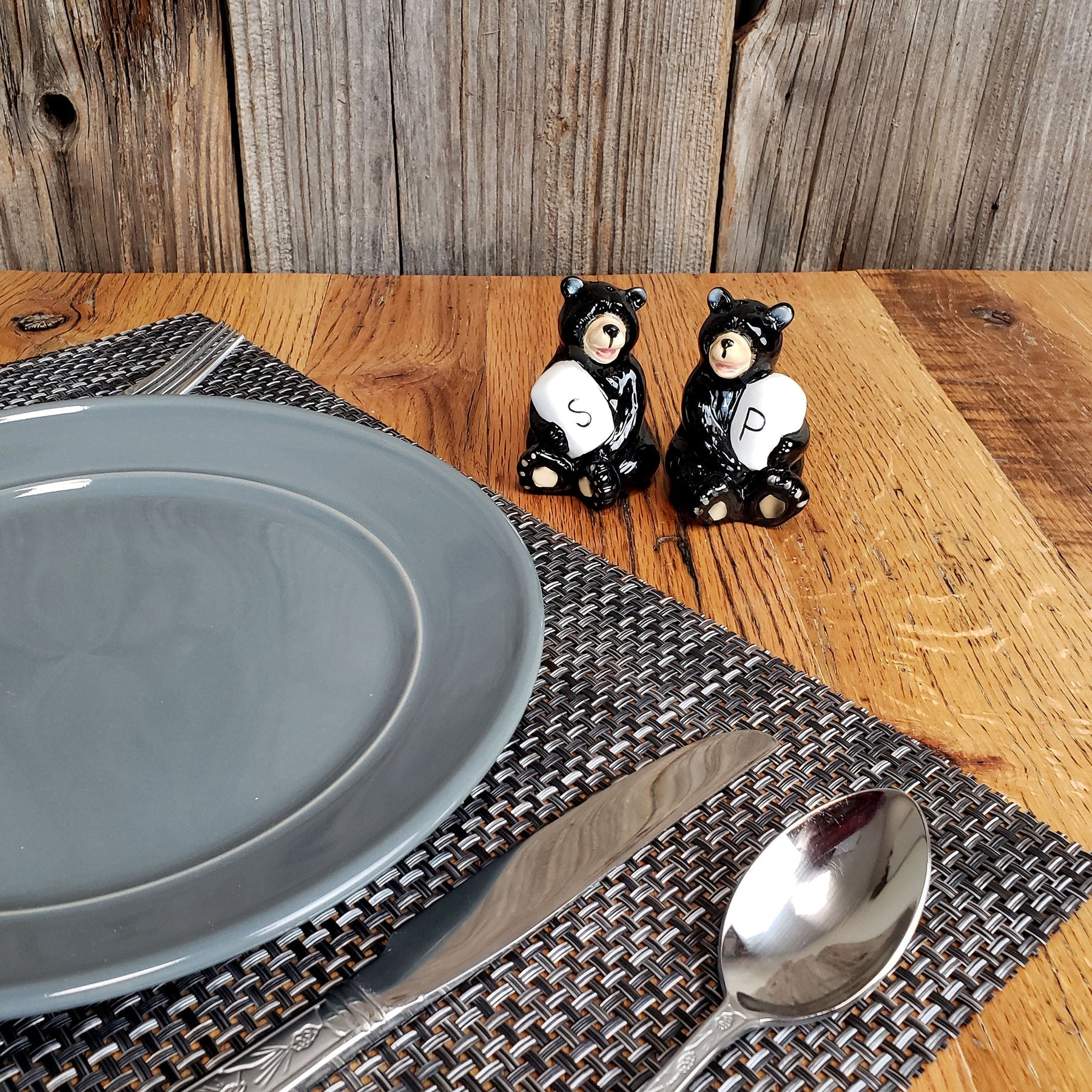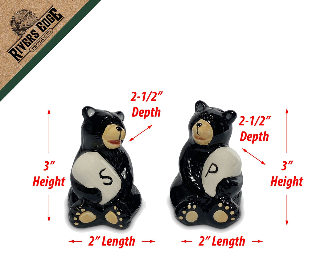 These black bear salt and pepper shakers from Rivers Edge Products are sold as a matching pair and will be a welcome addition to your dining room table. These salt and pepper shakers are made of ceramic and are painted to resemble a smiling black bear. Each bear is holding a white salt or pepper shaker. Marked with an S and P for easy identification so you'll never be mistaken when you season your food. The Black Bear salt and pepper shakers will allow you to season your meal with style.