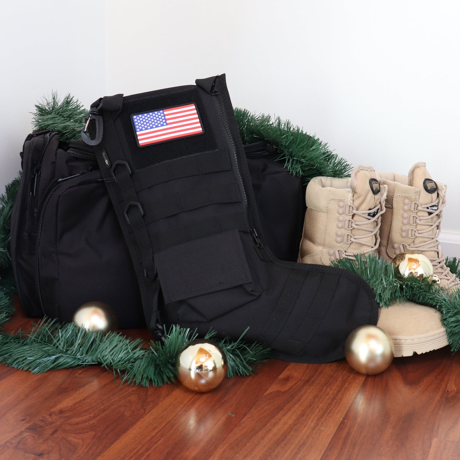 These Tactical Christmas Stockings from Osage River are ideal for your military or first responder friends and family. Made with durable 600D nylon, the army stocking feature a removable United States flag patch with hook and loop backing that will warm the heart of any patriot home for the holidays. The hook and loop surface is large enough so you can add or customize your own favorite patches on the stockings. Large enough to fit a variety of gifts from Santa and loved ones, the stockings measure 18 inches tall and 8.5 inches wide. Tactical MOLLE webbing, 3 D-rings, a pocket, and 2 swivel carabiners on the exterior offer plenty of external storage space if the stocking starts to overflow. If an item is too wide to fit completely into the stocking, use the dual-sided zipper to give your gifts some extra room. The reinforced heavy duty handle provides a practical method to hang or carry the stocking. Celebrate the holidays with the Tactical Christmas Stocking hanging above your fireplace.