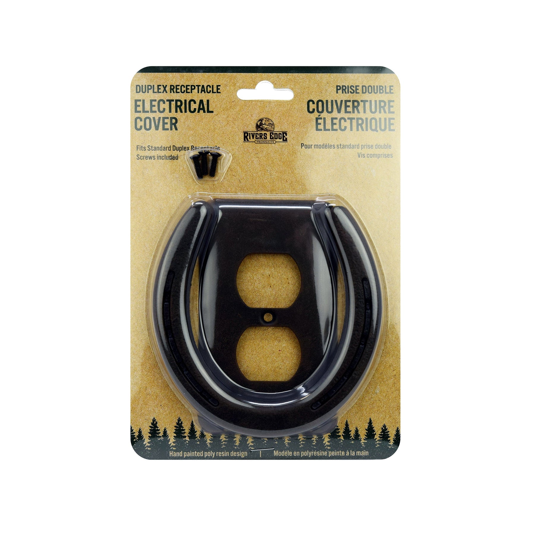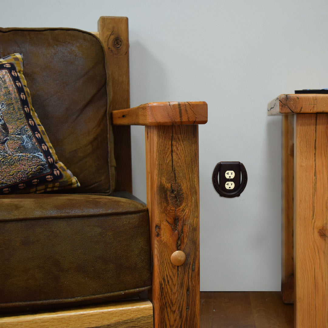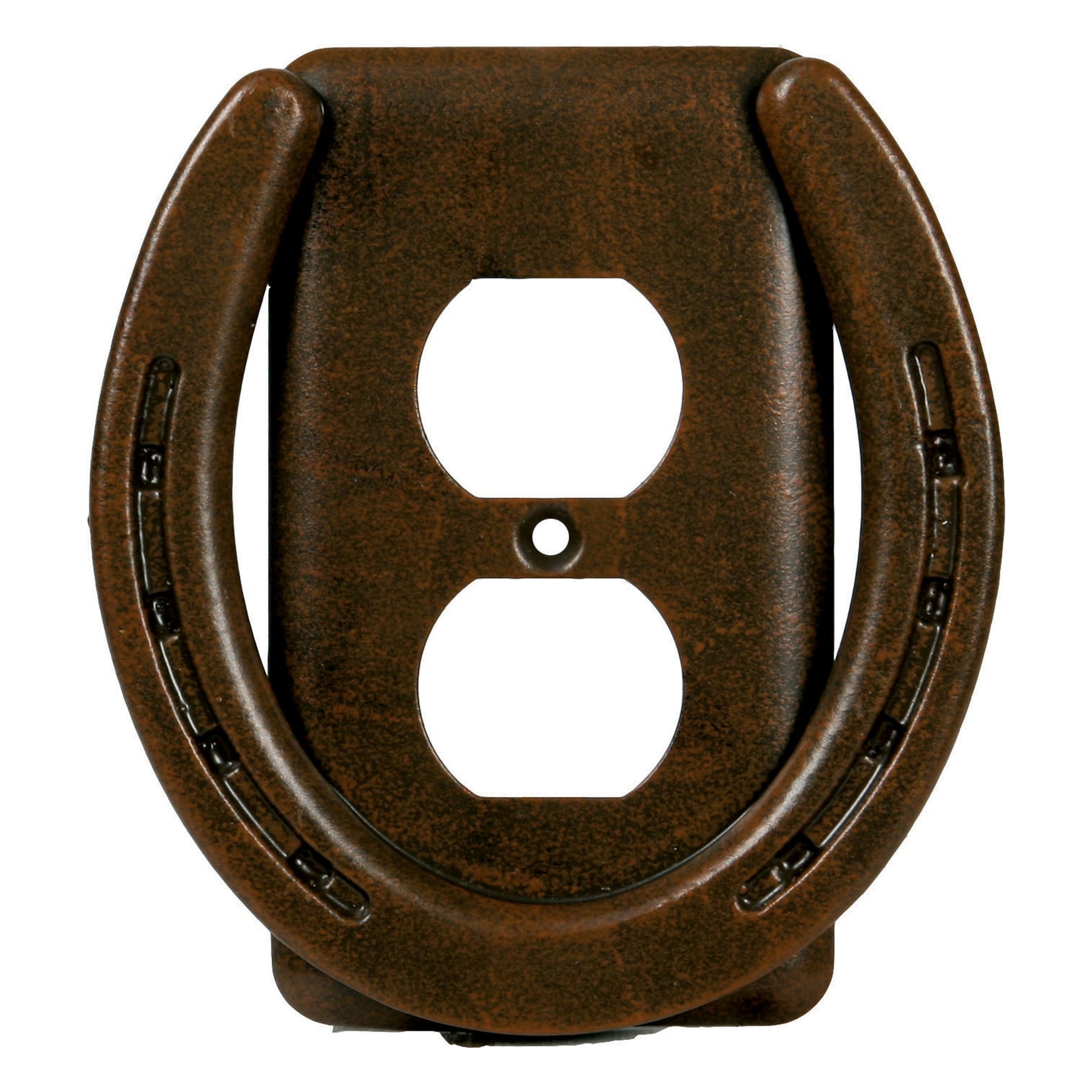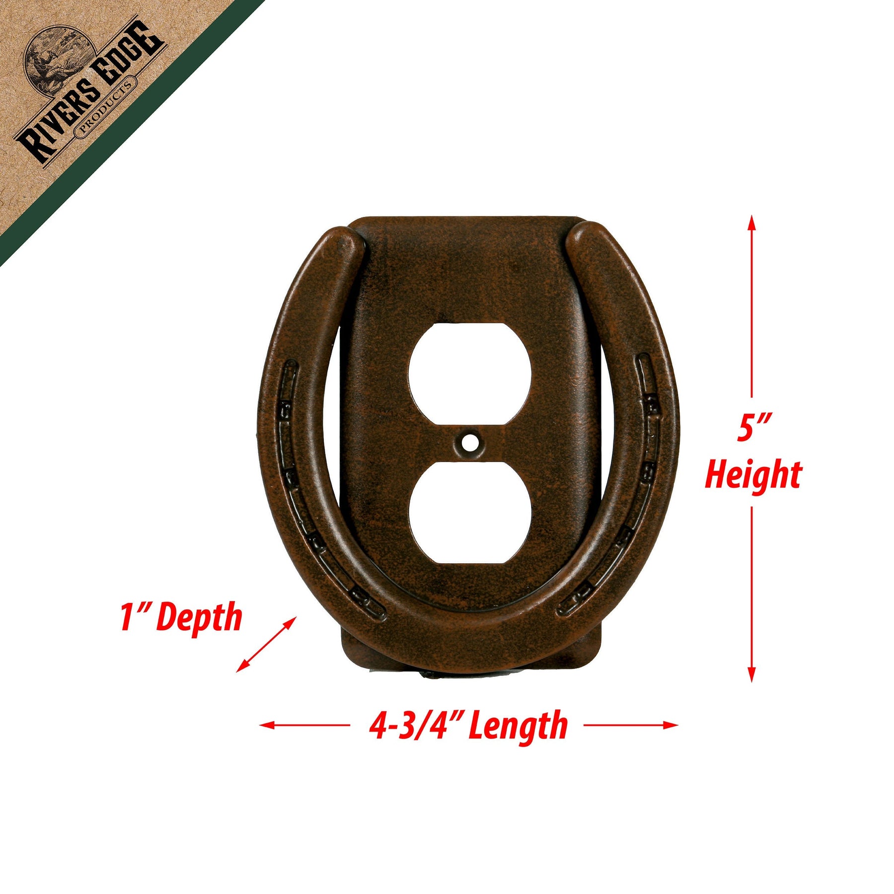 This receptacle cover from Rivers Edge Products is the ideal accent to complement fun western-themed decor. Features a brown, rusted horseshoe on top of a traditional cover that has the same finish as the horseshoe. Match this with our other Horse Shoe Wall Plate covers to complete your western decor.
