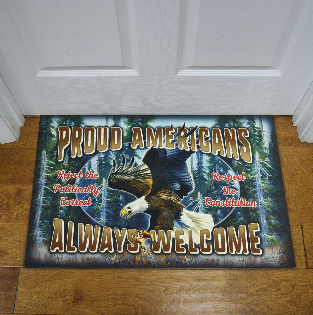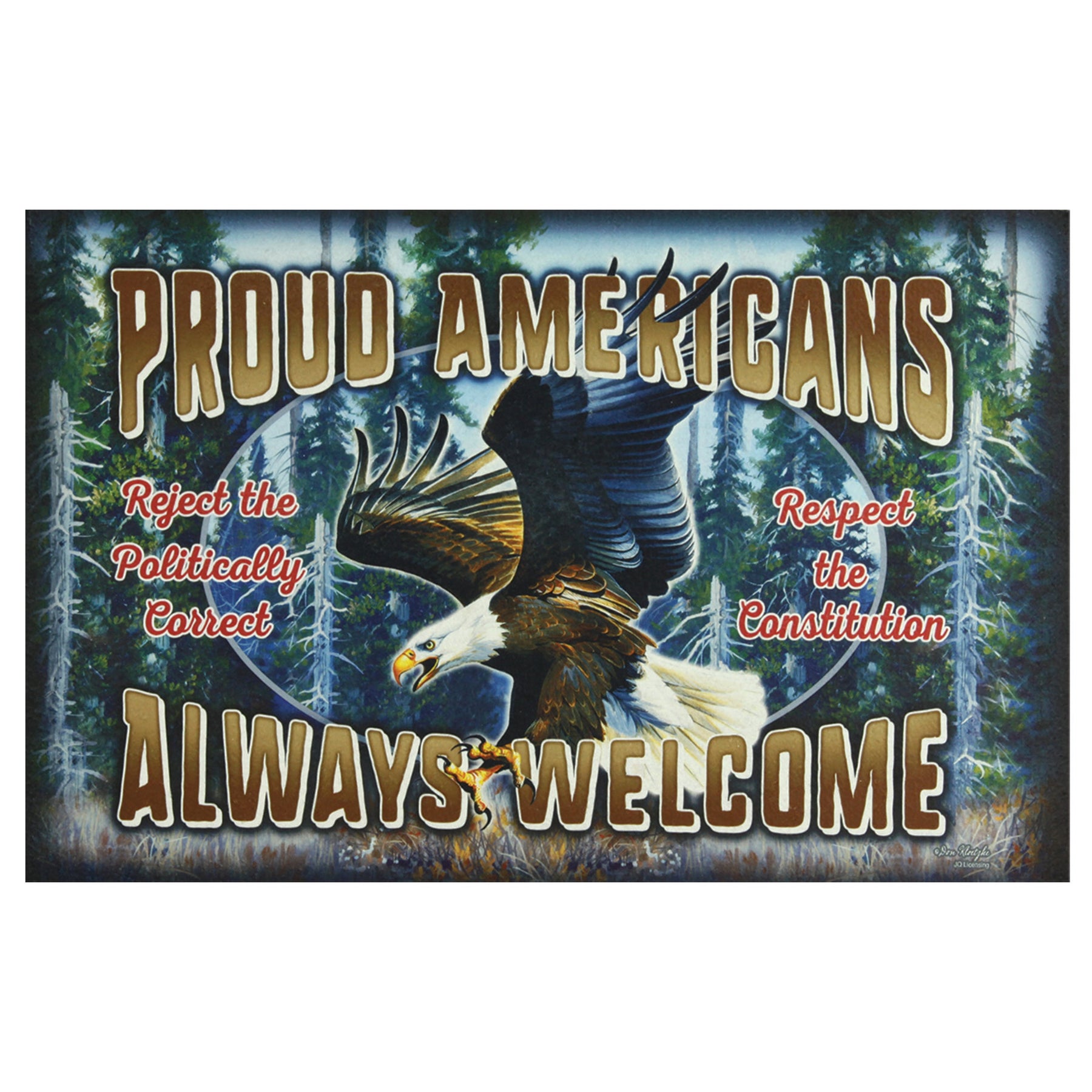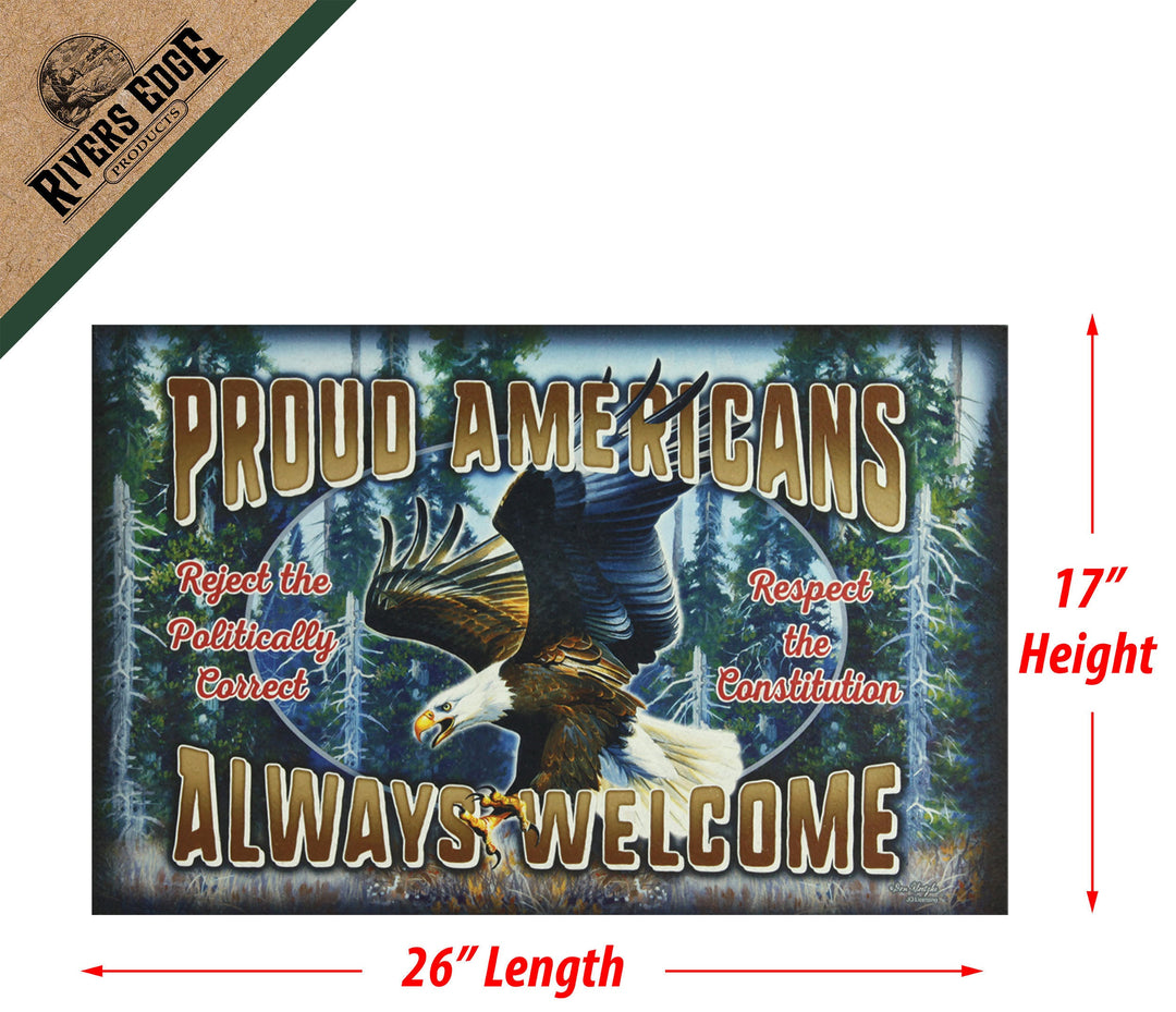 The rubber door mats from River's Edge Products features a eagle with 'Proud Americans Always Welcome'.