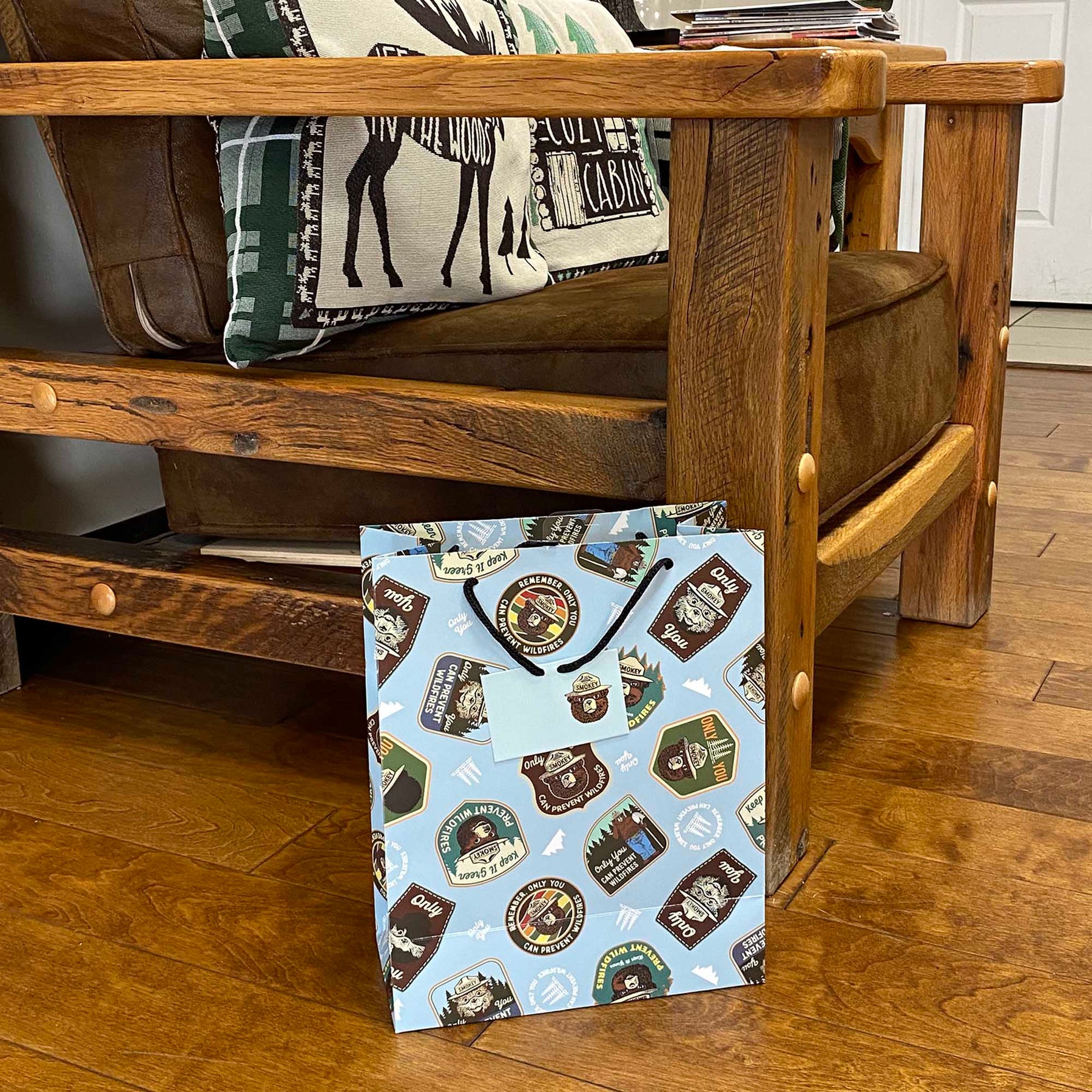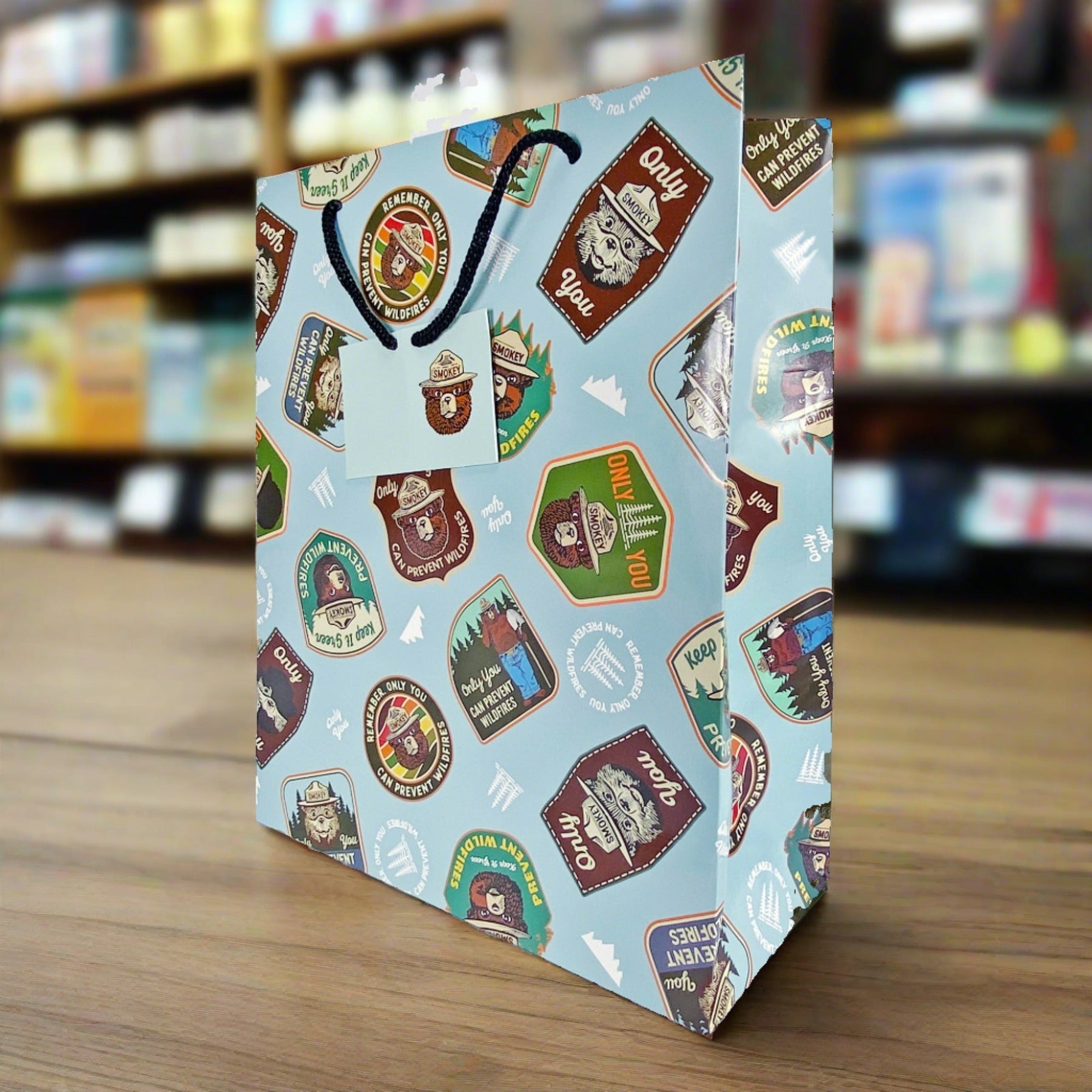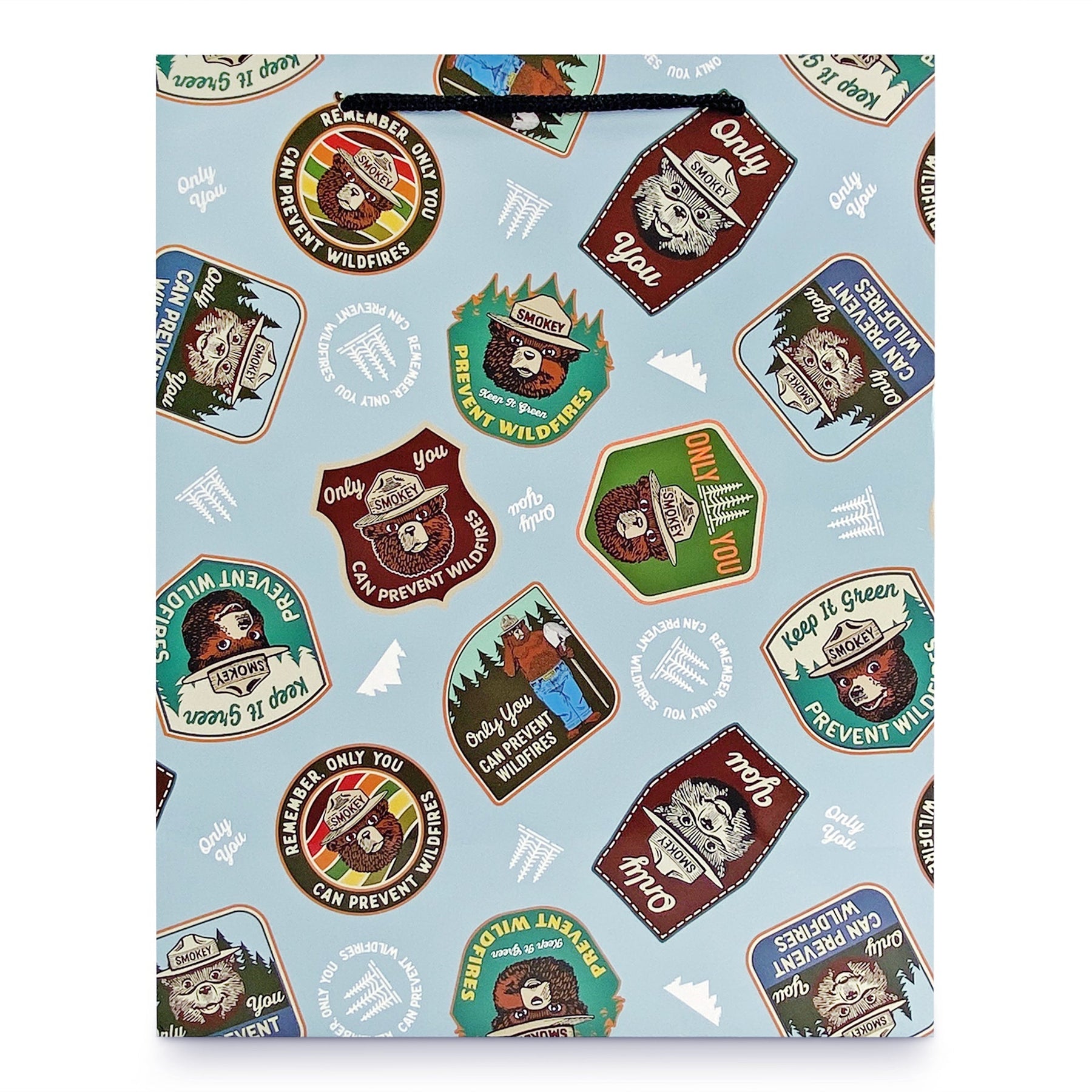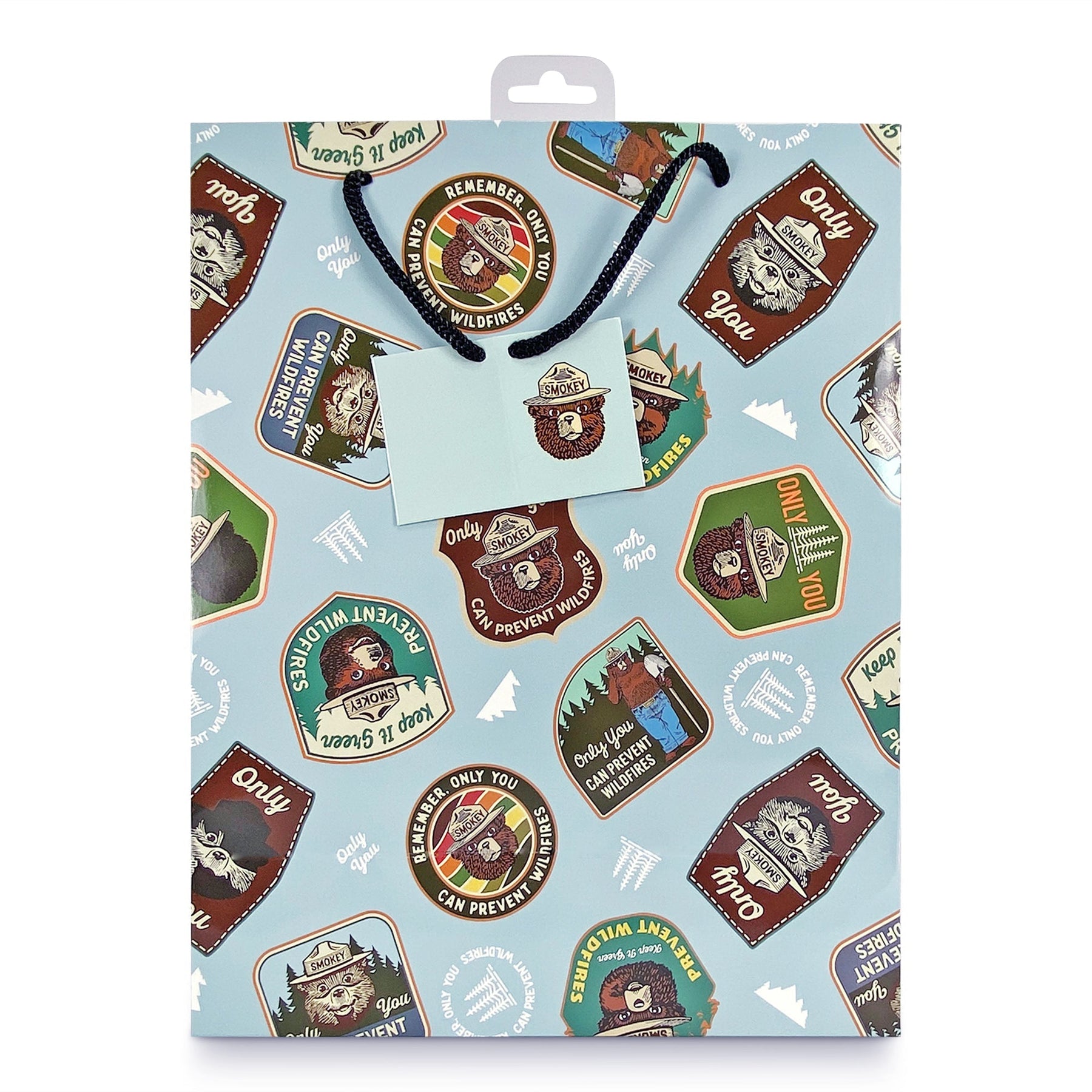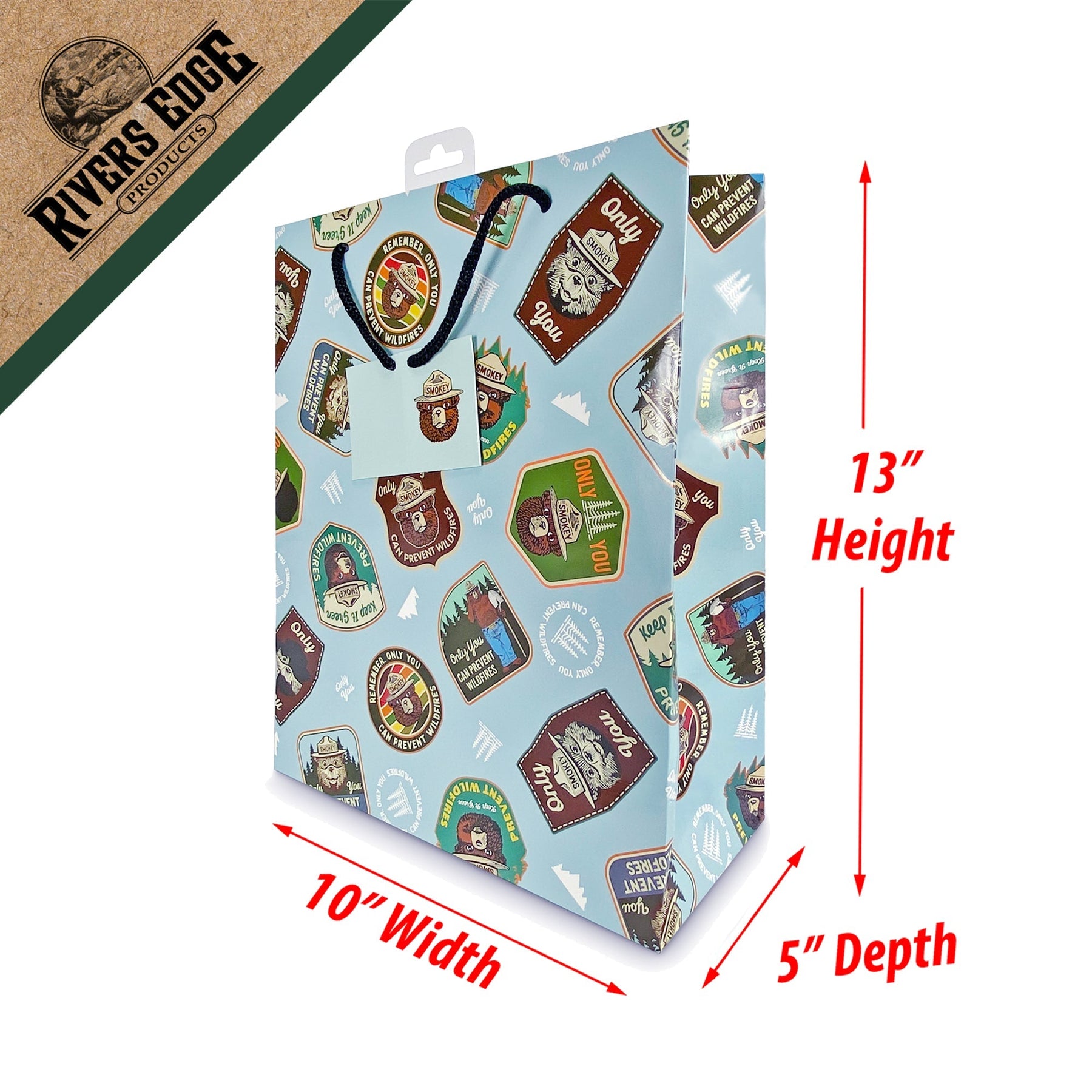 The Rivers Edge Products medium Smokey prevention quote badges gift bag features outstanding licensed artwork that showcases beautiful badges with Smokey's head. The bag also features nylon handles, an attached card, and a removable hang tab for pegboard hanging. These gift bags measure 13-inches by 10-inches by 5-inches. Perfectly compliment any gift for an outdoor enthusiast with this gift bag.