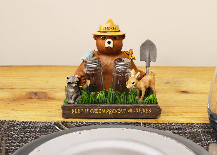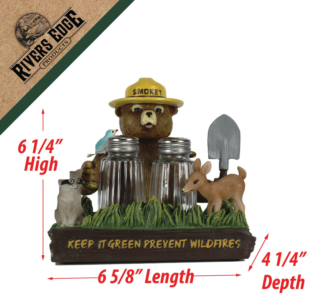 This Smokey Friends & Nature salt and pepper shaker set from Rivers Edge Products will be a welcome addition to your dining room table. These glass salt and pepper shakers fit nicely into the base. The base is hand-painted poly resin and is highly detailed with Smokey and his friends. The shakers are made of clear glass so you'll never mistake salt for pepper when you season your food. The Smokey Bear & Nature salt and pepper shakers will allow you to season your meal with style.