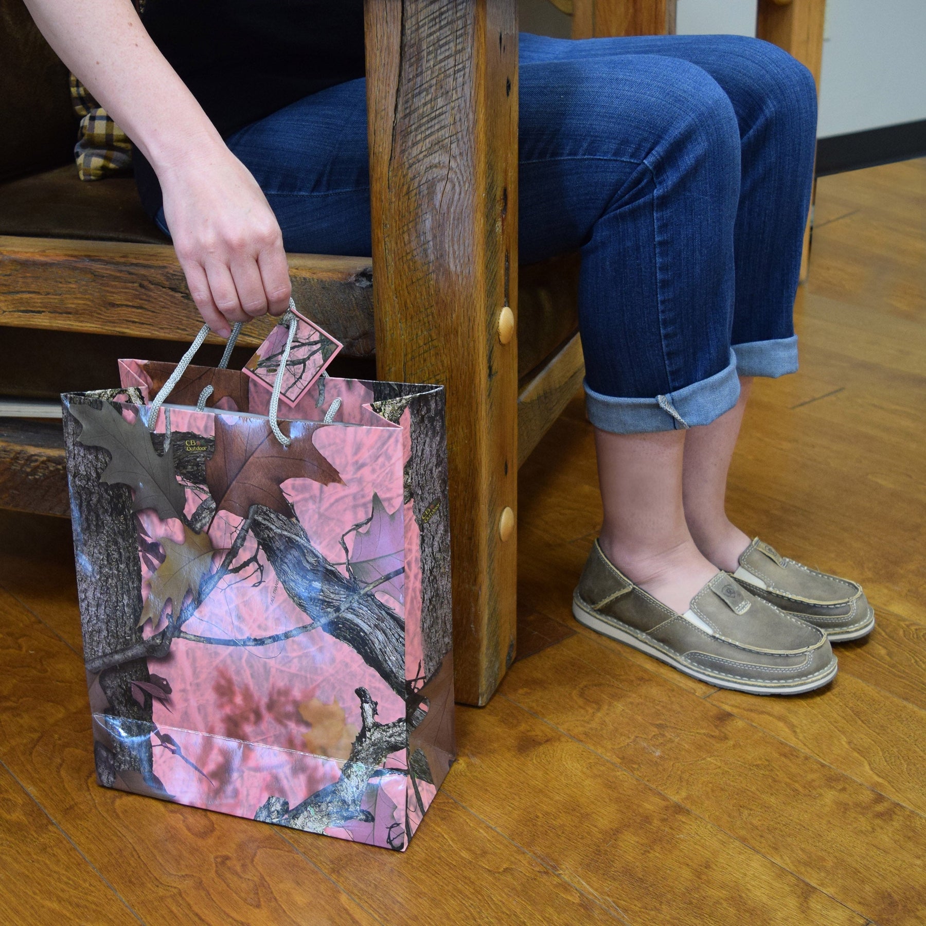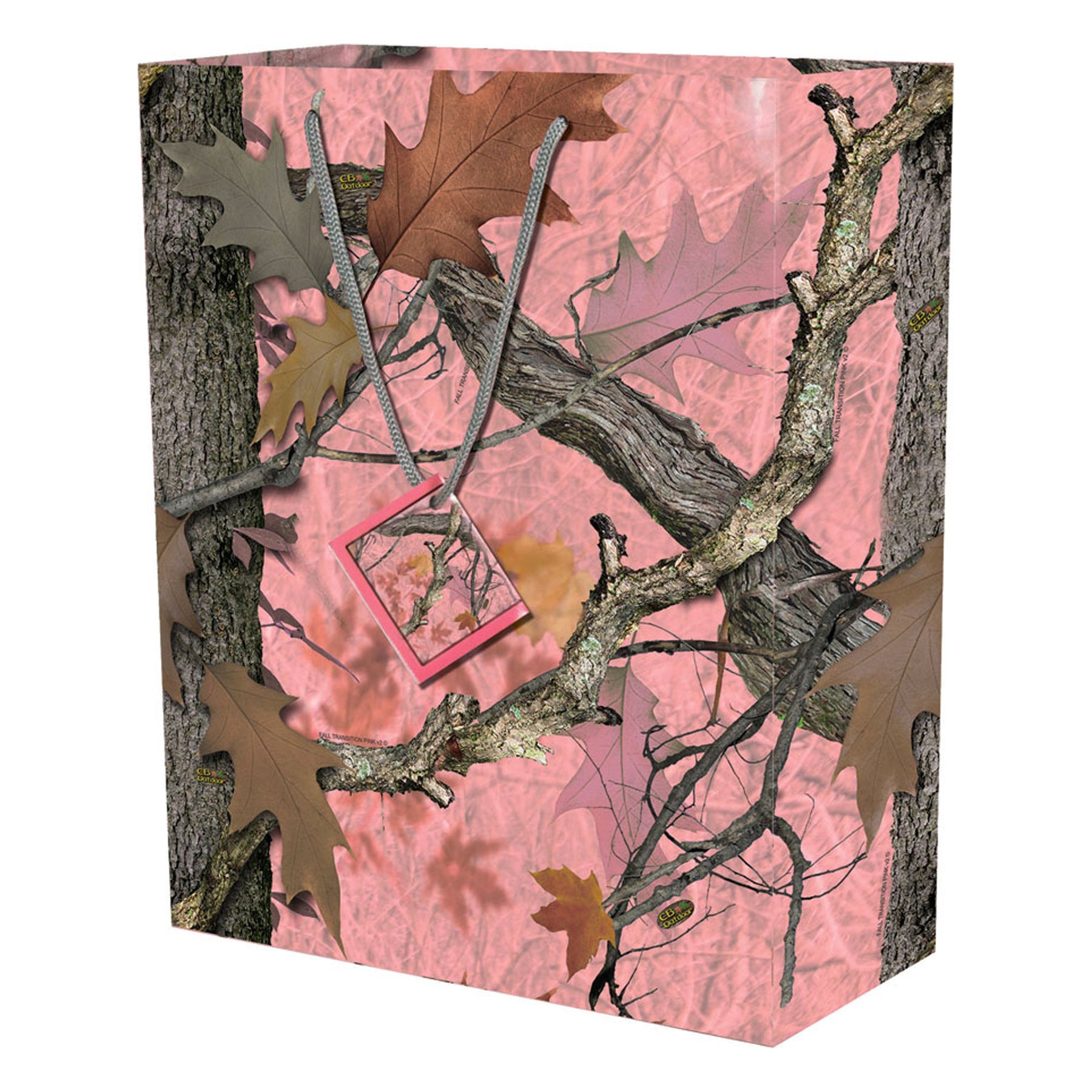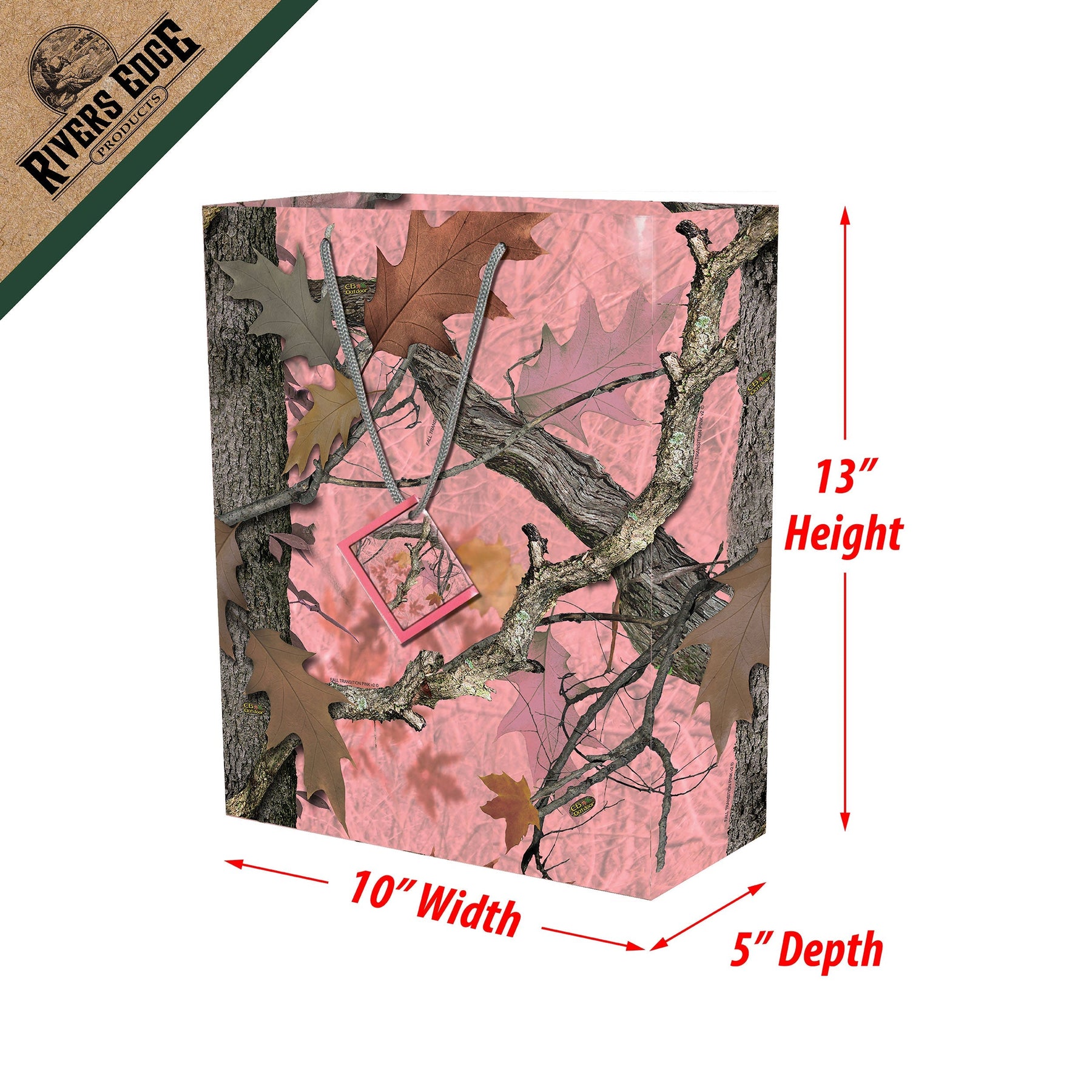The Rivers Edge Products large camo green gift bag features pink Fall Transition camo courtesy of CB Outdoors. The bag also features nylon handles, an attached card, and a removable hang tab for pegboard hanging. These gift bags measure 13-inches by 10-inches by 5-inches. Perfectly compliment any gift for an outdoor enthusiast with this gift bag. Priced each and sold by the dozen only.