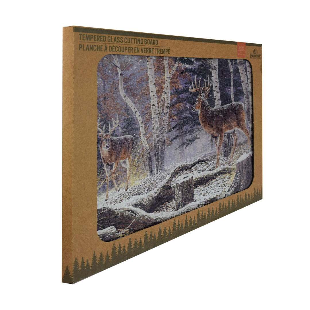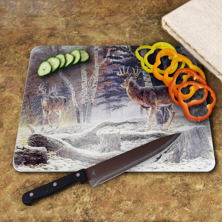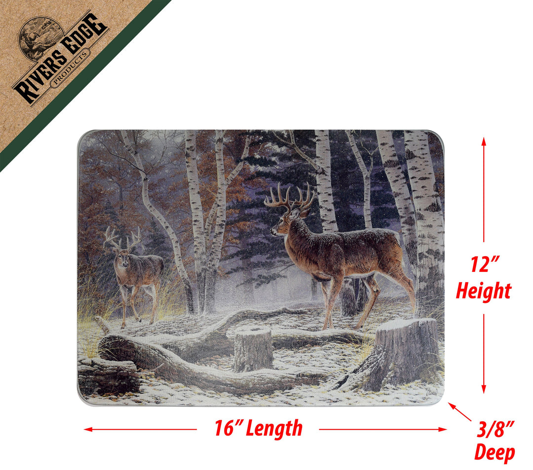 Confrontation tempered glass cutting boards from Rivers Edge Products features a two bucks and a snowy background.