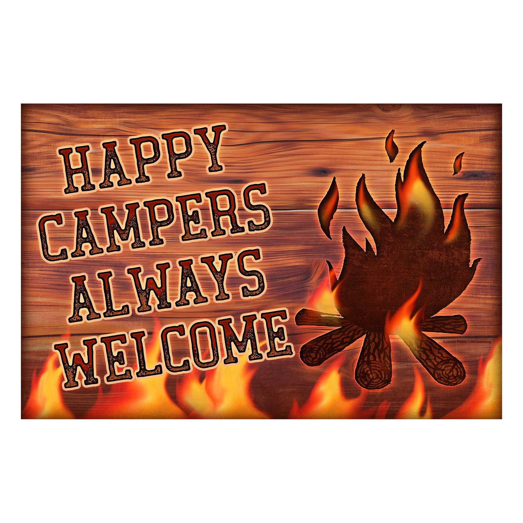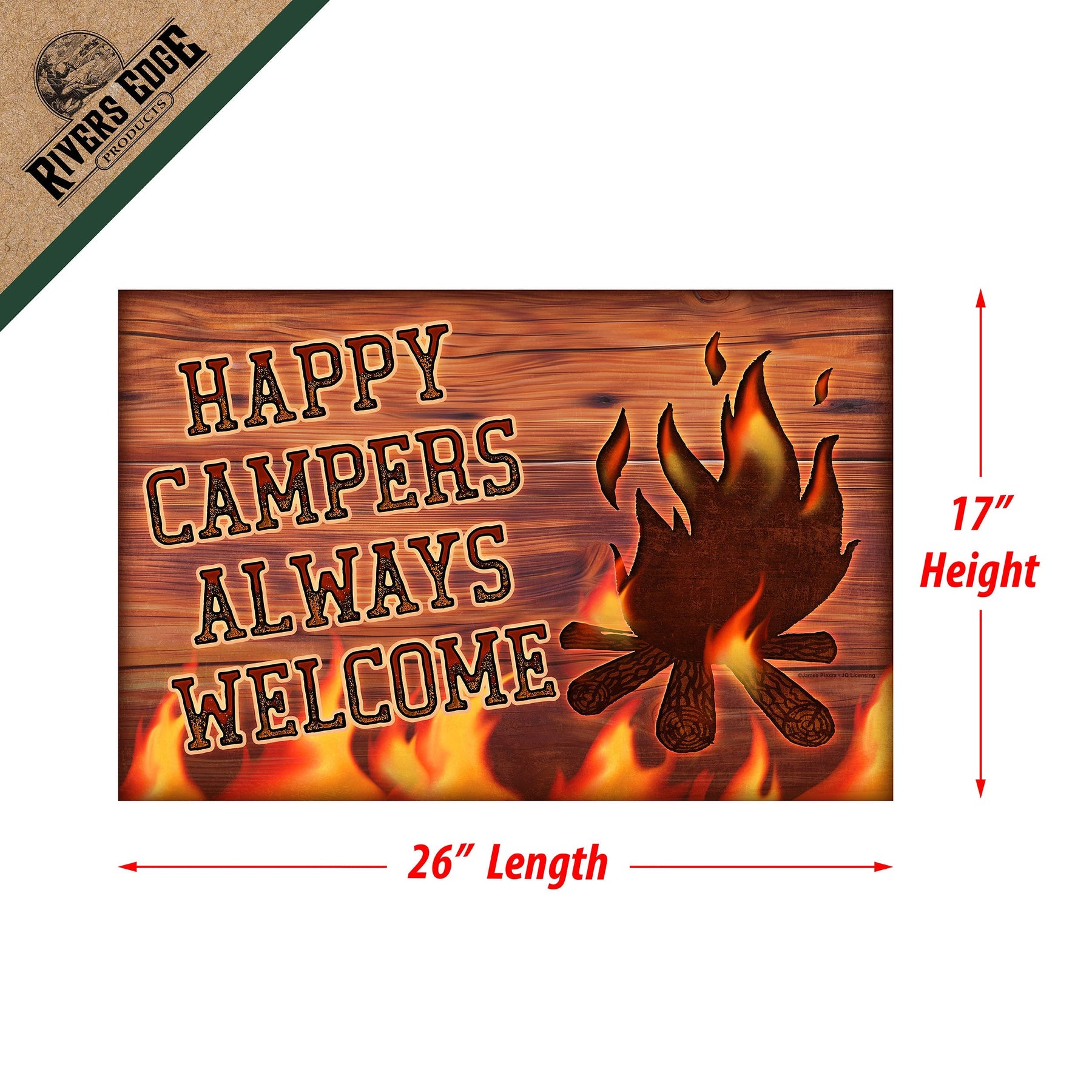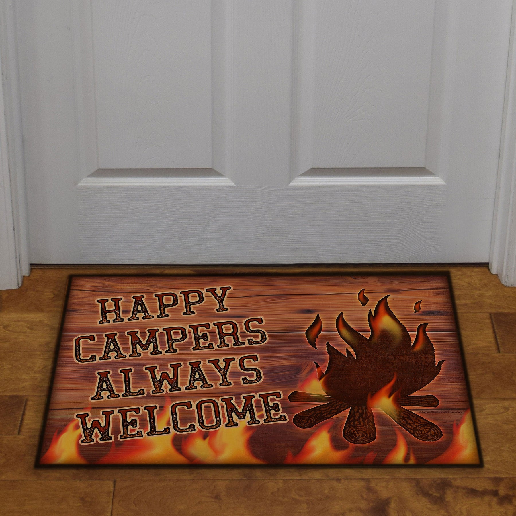 The rubber door mats from River's Edge Products measure features a fire with 'Happy Campers Always Welcome'.