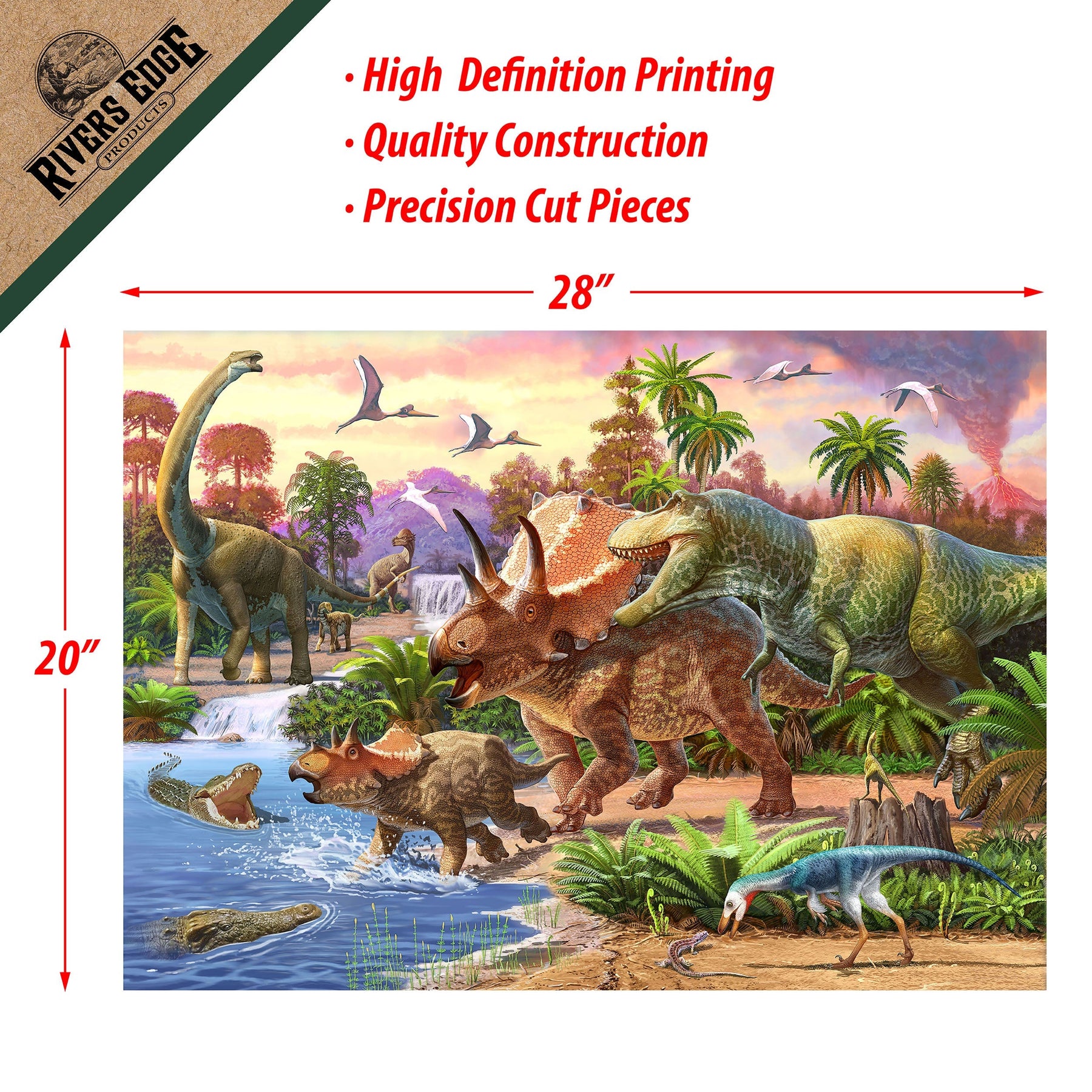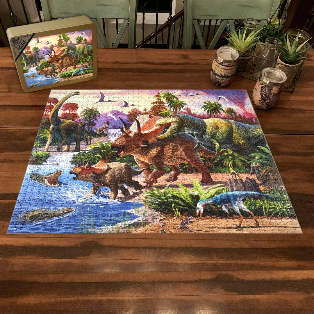 This jigsaw puzzle from Rivers Edge Products comes in an attractive embossed tin. The artwork on the tin matches the puzzle inside. This puzzle features a group of dinosaurs titled Dinosaurs at the Watering Hole by a consortium of global artists through MHS Licensing. This work of art showcases a group dinosaurs gathering to the waterhole in a prehistoric setting.