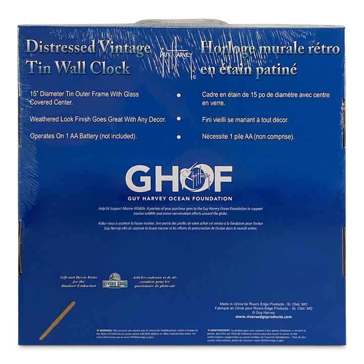 This round wall clock from River's Edge Products is designed with a distressed finish to embrace a cozy, outdoors theme. The clock face is covered with protective glass and features an illustration of a par of marlin by Guy Harvey. A portion of your purchase goes to the Guy Harvey Ocean Foundation to support marine wildlife and ocean conservation efforts around the globe.