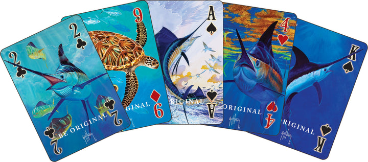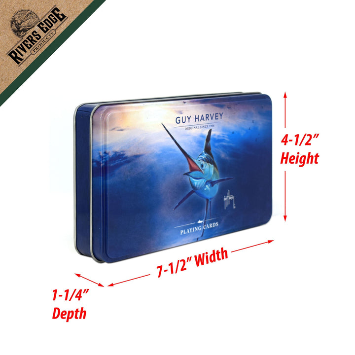 These River's Edge Products cards and dice are an amazing pair and a must have for any game night. Includes 2 decks of casino quality playing cards and 5 dice, in an attractive felt lined gift tin with embossed lid. Attractively packaged in a full color clam pack. These playing cards feature the designs of renowned artist and conservationist Guy Harvey, each 56 card deck has a unique, corresponding Guy Harvey image for each card of the suit. Help Us Support Marine Wildlife. A portion of your purchase goes to the Guy Harvey Ocean Foundation to support marine wildlife and ocean conservation efforts around the globe.