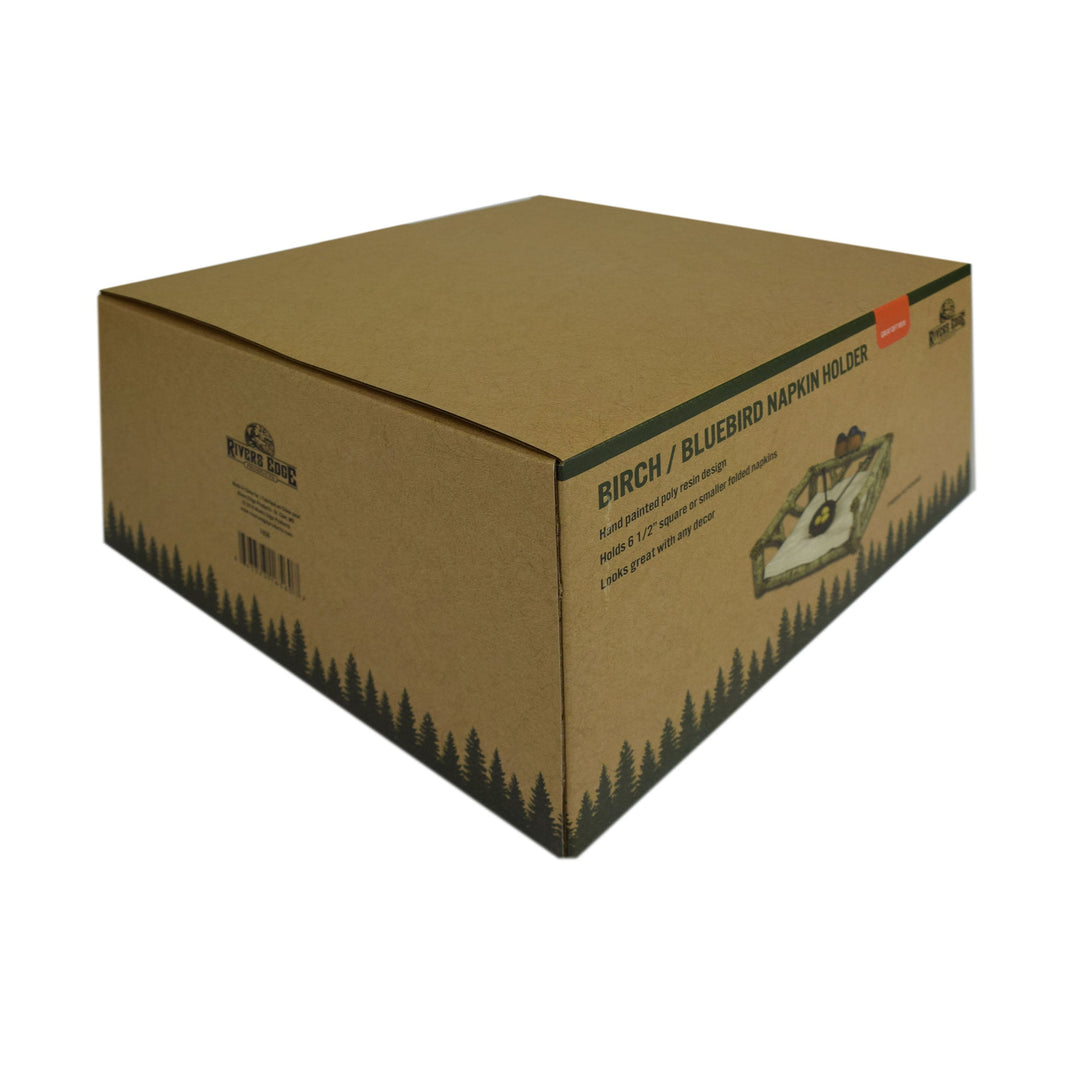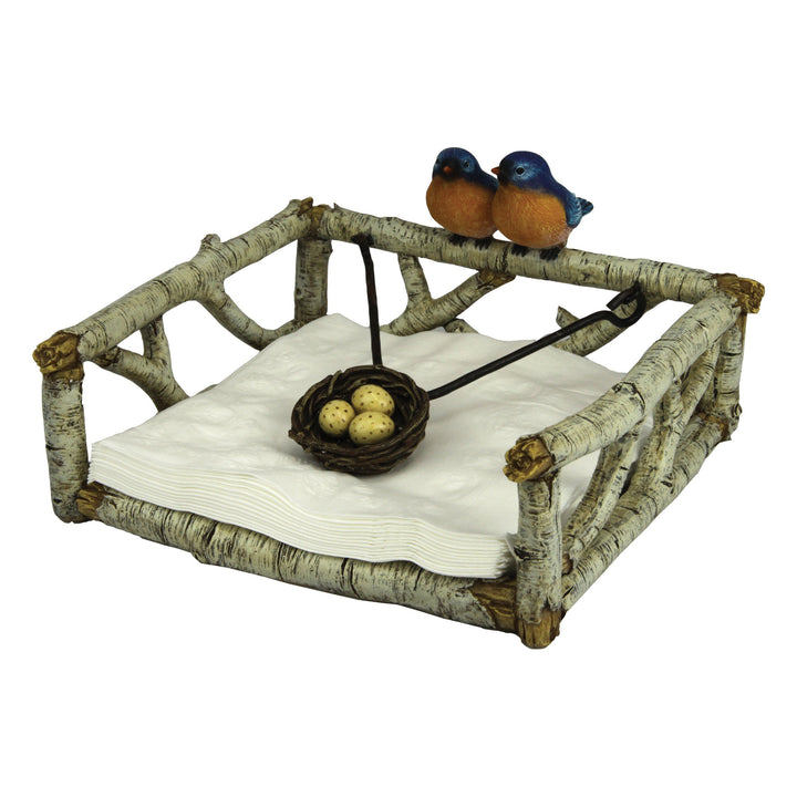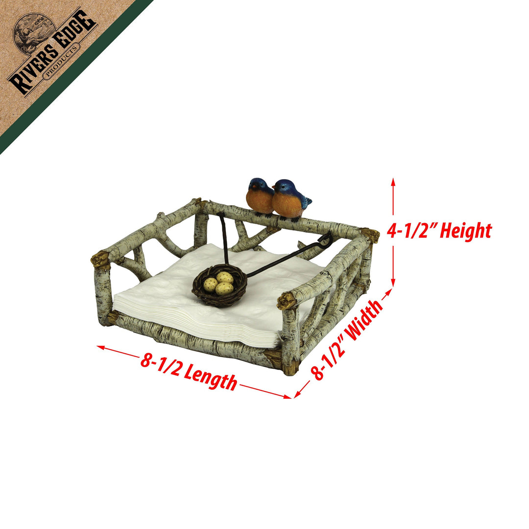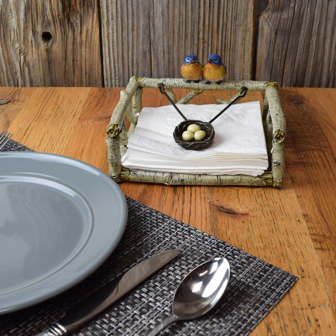 The birch blue bird napkin holder from River's Edge Products showcase two birds, perched on top of the birch tree boarder, watching over their nest. The nest doubles as a weight to keep the napkins in place and unaffected by the wind.