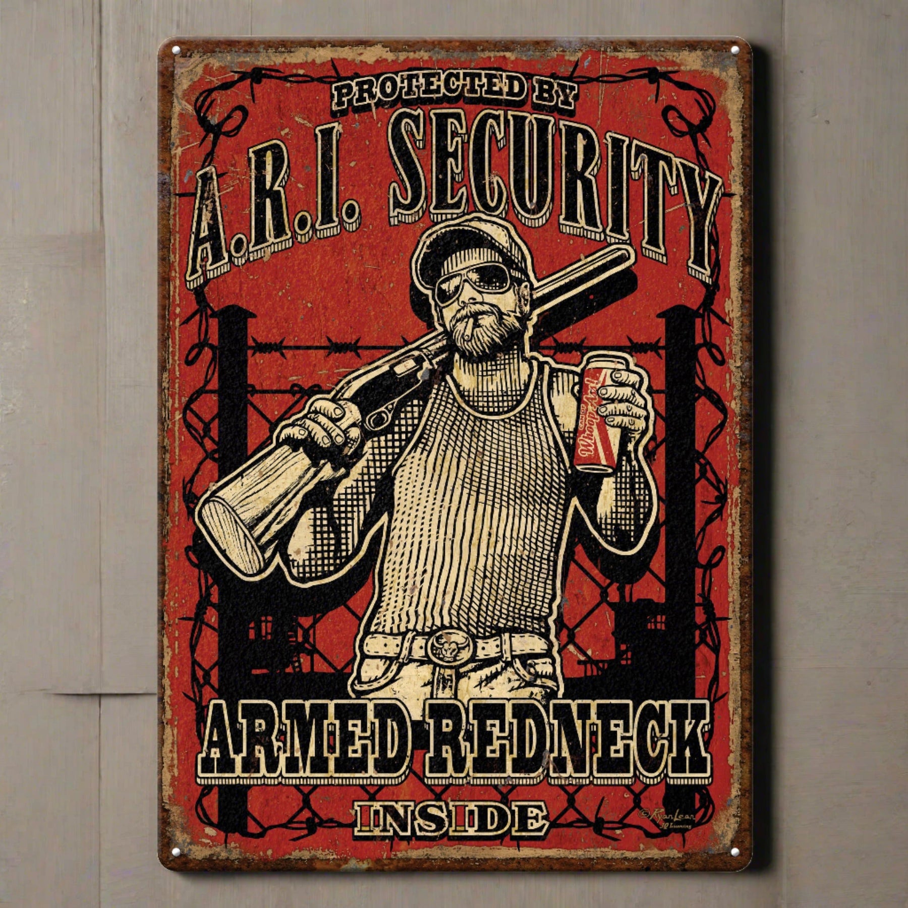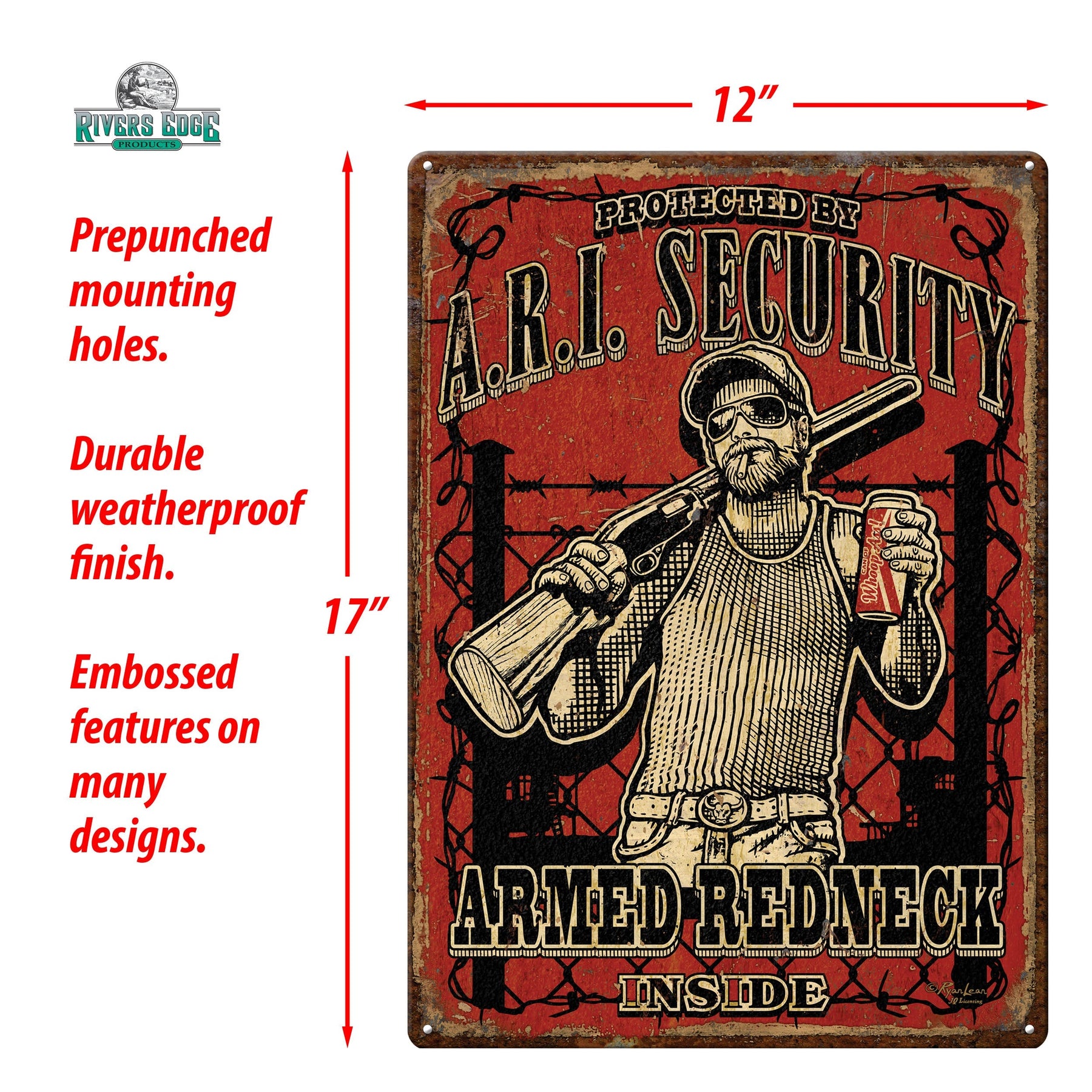 This metal tin sign from Rivers Edge Products is ideal wall decor for outdoor enthusiasts with a sense of humor. The sign features the messages 'Protected By A.R.I. Security - Armed Redneck Inside' in stylized capital letters with an illustration of a man holding a gun and beer. Customize your garage, home bar, or living space with this funny tin sign.