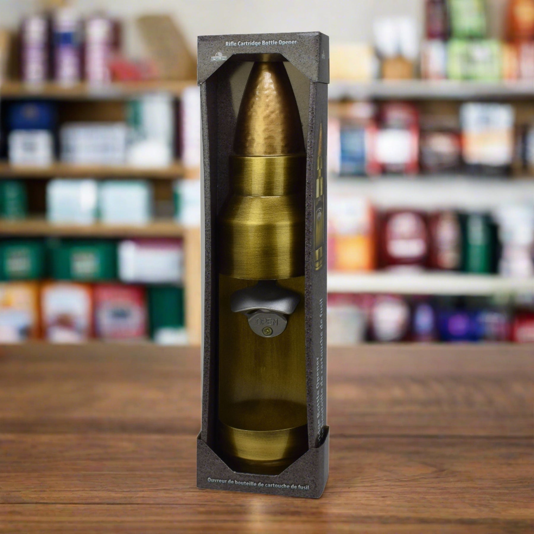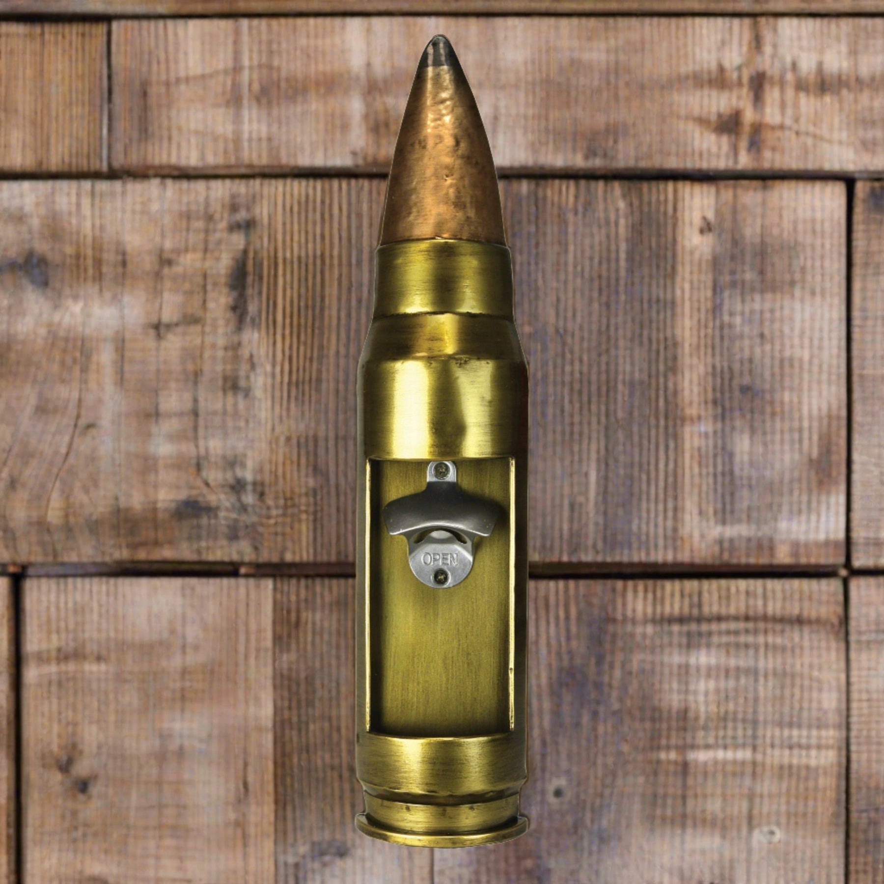 Add a unique touch to your bar or kitchen with this wall-mounted bottle opener, designed to resemble a replica of a rifle cartridge.