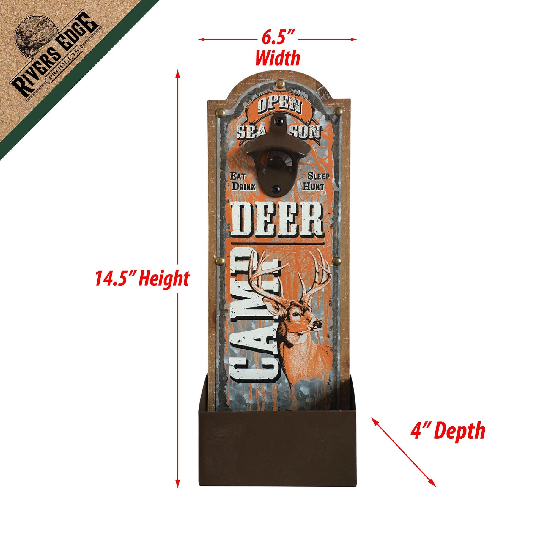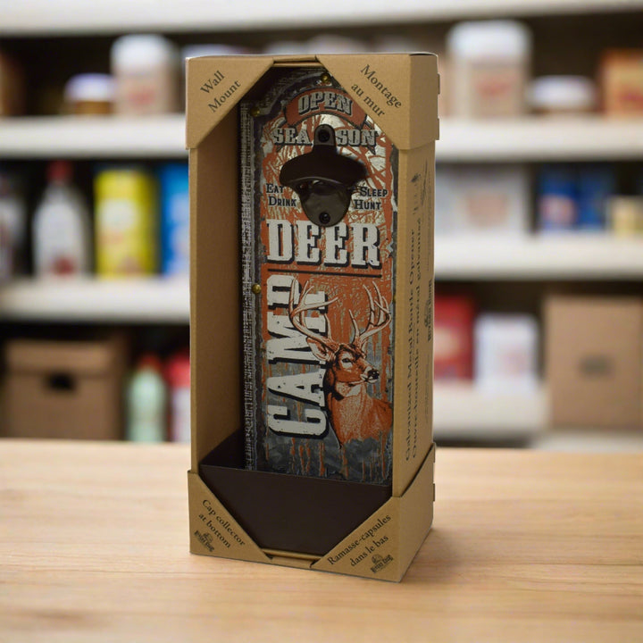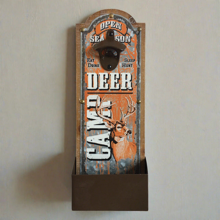 The open season deer camp bottle opener from River's Edge Products will be a great addition to any hunting enthusiast's home bar or man cave. This bottle opener features the message "Open Season Deer Camp" with a whitetail buck design.