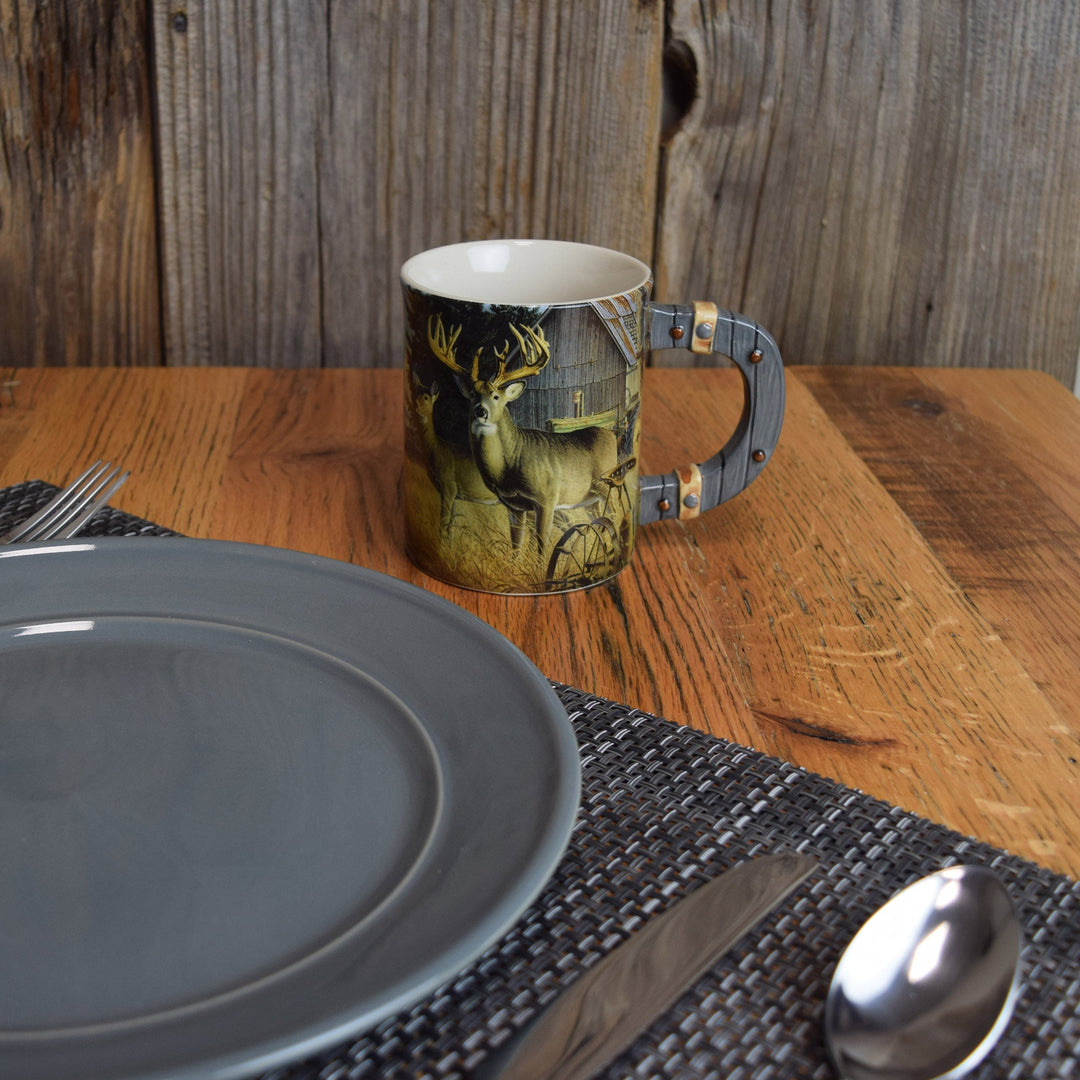 This deer on farm 3D ceramic mug by River's Edge Products is ideal for any outdoor enthusiast. It features a three-dimensional design of a few deer walking around a farm that wraps completely around the mug. Its impressive artwork extends to the hand painted handle sculpted to resemble a wooden handle.