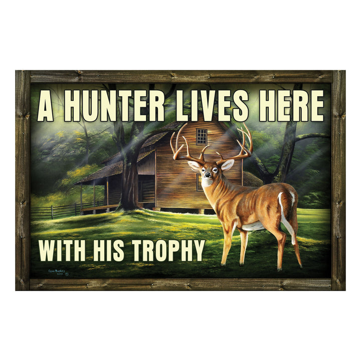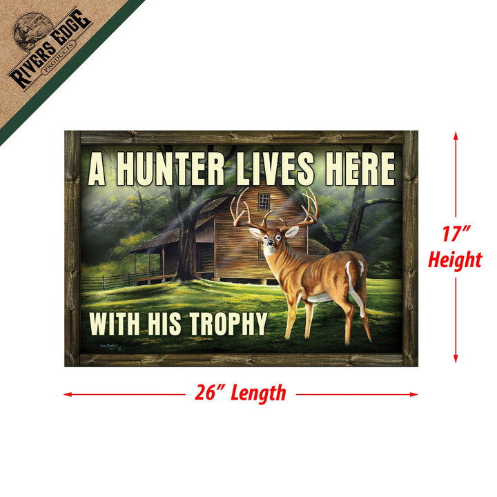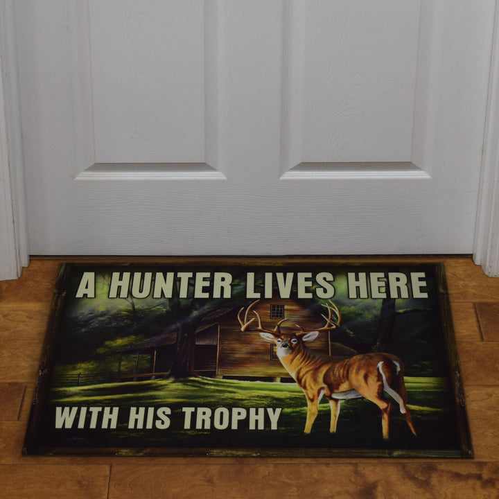 The rubber door mats from River's Edge Products features a deer with a cabin in the background.