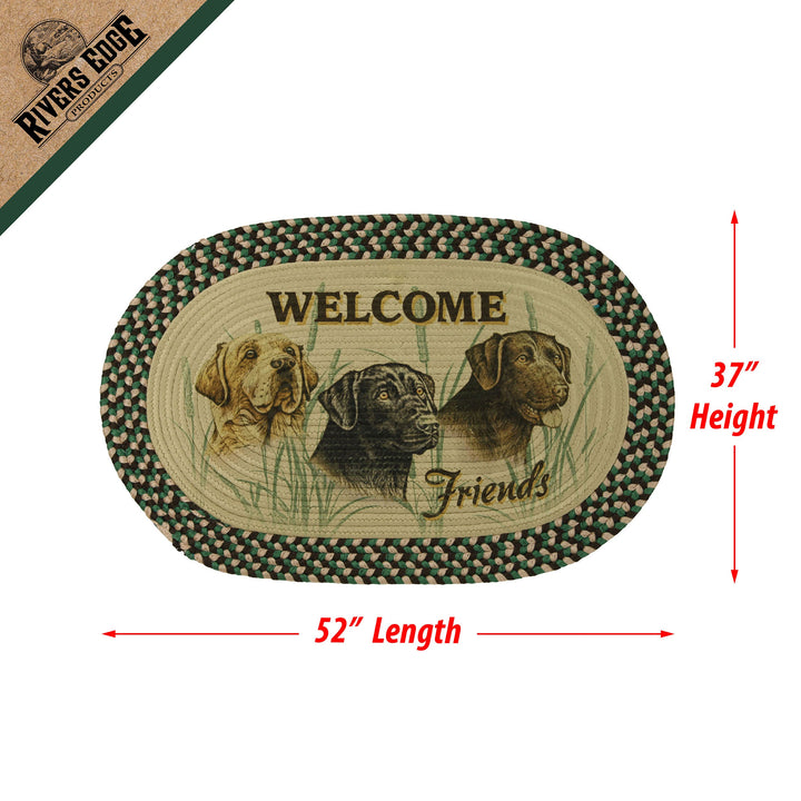 Three Labrador retrievers in black, chocolate, and yellow surrounded by a cattail patterned background. A rug pad is recommended to provide slip resistance on hard surfaces in your home; a rug pad is not included with this item.