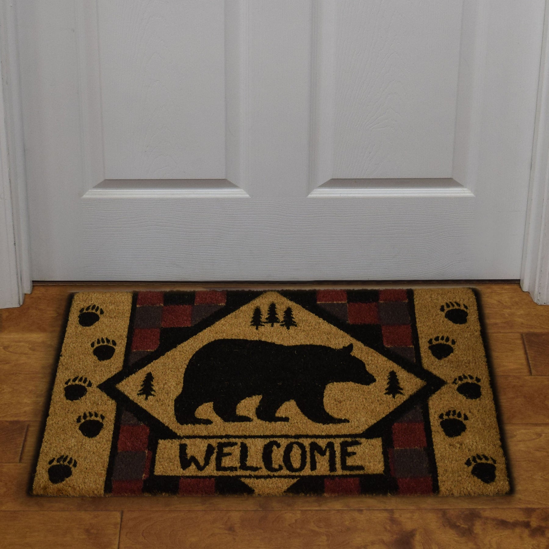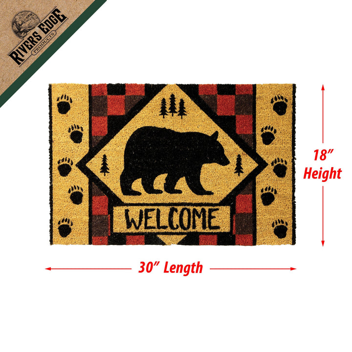 The bear coir welcome mat by River's Edge Products will make your porch more welcoming with its friendly greeting. The mat features a black bear silhouette in a diamond shape surrounded by a red and gray checkerboard pattern framed on the sides by bear paw prints.