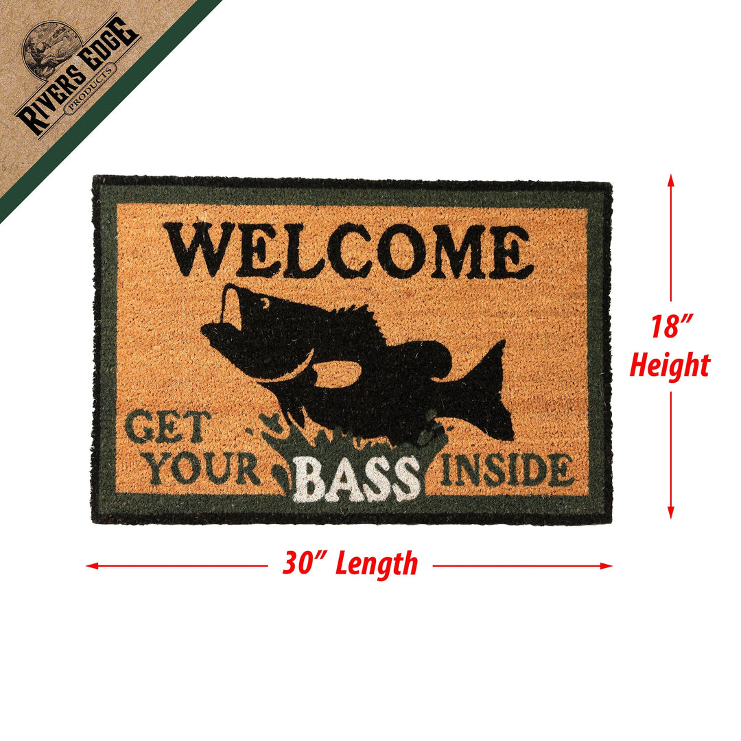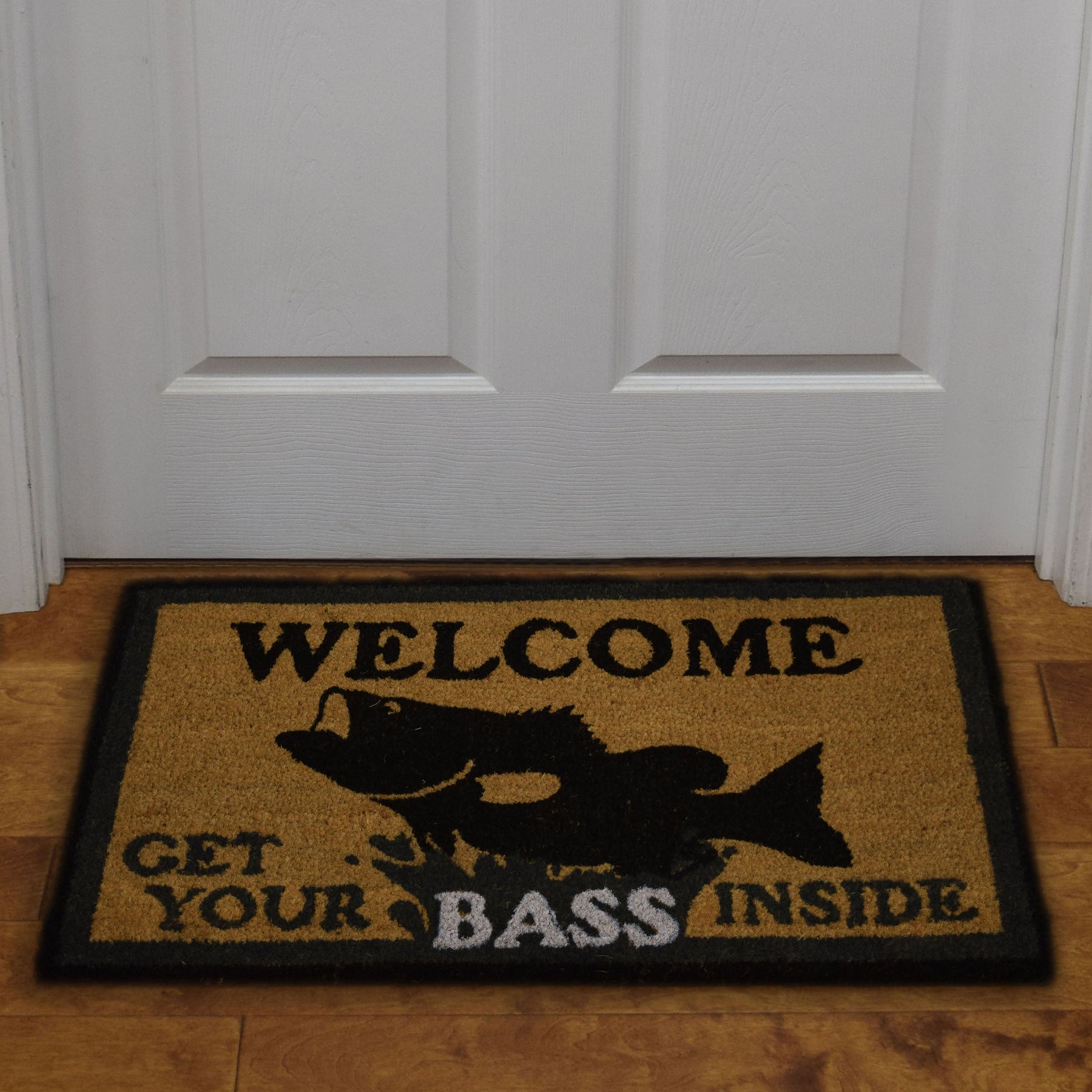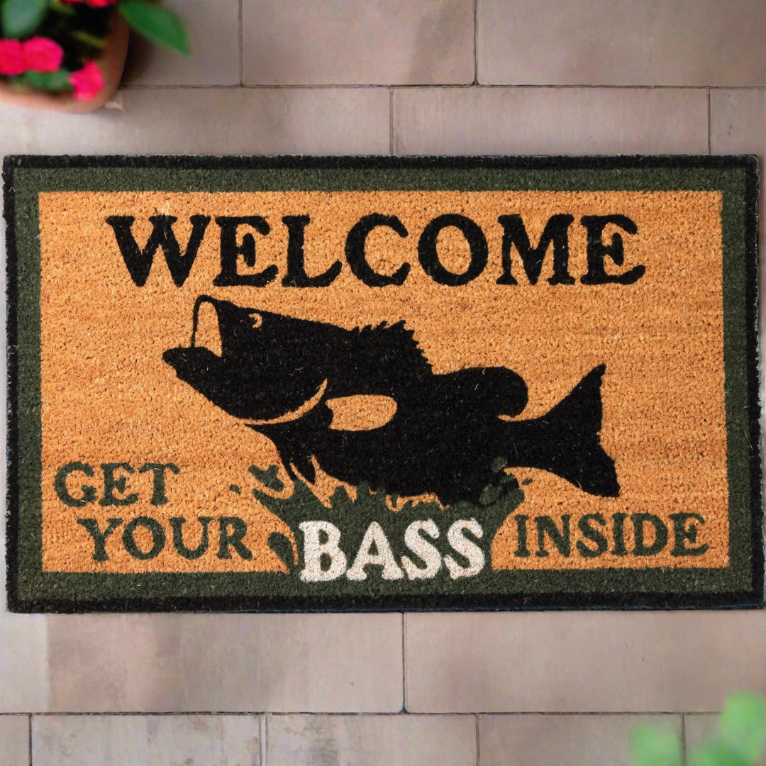 The bass coir mat features a largemouth bass above a splash of water with the word "Welcome" centered above it. The feisty message "Get Your Bass Inside" is displayed along the bottom border.