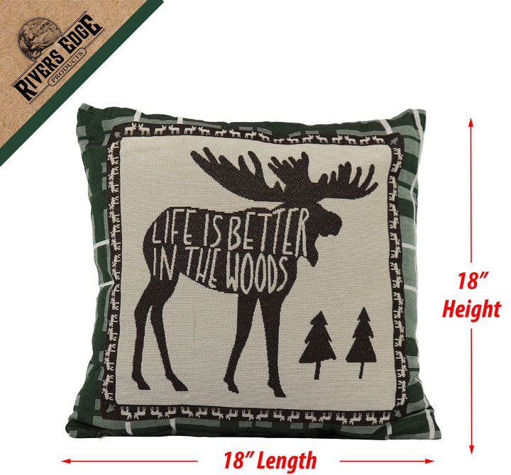 This pair of moose tapestry throw pillows from River's Edge Products will complement your cabin decor and emphasize the wildlife appreciation in your home. These tapestry pillows' licensed artwork features a simplified moose silhouette surrounded by evergreen trees. The illustration is framed with moose in alternating directions and a green plaid pattern. With the words Life is Better in the Woods centered in this design, these tapestry throw pillows will complete your cozy cabin style. To care for your tapestry pillows, unzip and remove the tapestry covers to spot clean only. The Moose Tapestry Throw Pillows will supply your home with a friendly, rustic feeling of hospitality far from civilization.