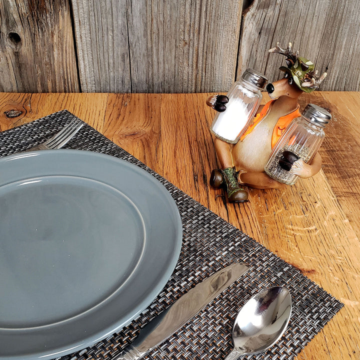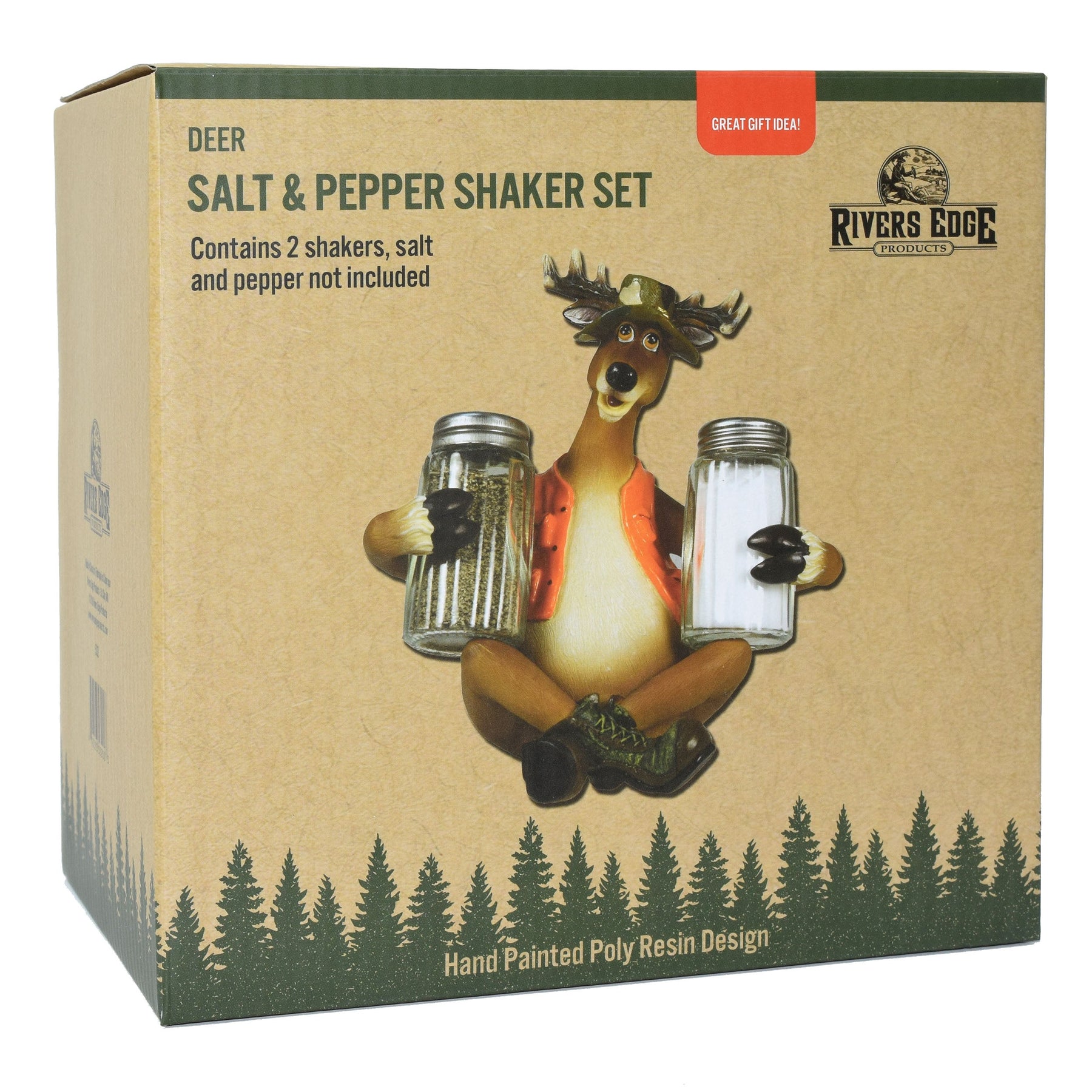 These deer salt and pepper shakers from Rivers Edge Products are sold as a matching pair and will be a welcome addition to your dining room table. These glass salt and pepper shakers fit nicely into the arms of cartoonish looking deer. The deer base is hand-painted poly resin and is detailed designed with the deer wearing a camo fishing hat, orange hunting vest, and boots. The shakers are made of clear glass so you'll never mistake salt for pepper when you season your food. The Deer salt and pepper shakers will allow you to season your meal with style.