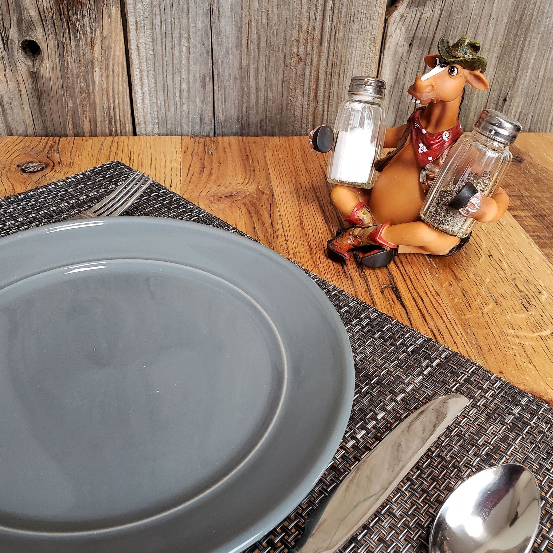 These horse salt and pepper shakers from Rivers Edge Products are sold as a matching pair and will be a welcome addition to your dining room table. These glass salt and pepper shakers fit nicely into the arms of cartoonish looking horse. The horse base is hand-painted poly resin and is detailed designed with the horse wearing a cowboy hat, red bandana, vest, and cowboy boots. The shakers are made of clear glass so you'll never mistake salt for pepper when you season your food. The Horse salt and pepper shakers will allow you to season your meal with style.