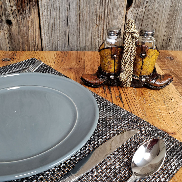 These cowboy boots salt and pepper shakers from Rivers Edge Products are sold as a matching pair and will be a welcome addition to your dining room table. These glass salt and pepper shakers fit nicely into each cowboy boot. The brown cowboy boots are hand-painted poly resin and are highly detailed with some rope in between each boot. The shakers are made of clear glass so you'll never mistake salt for pepper when you season your food. The Cowboy Boots salt and pepper shakers will allow you to season your meal with style.