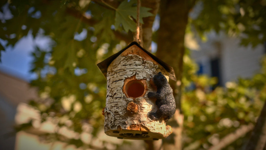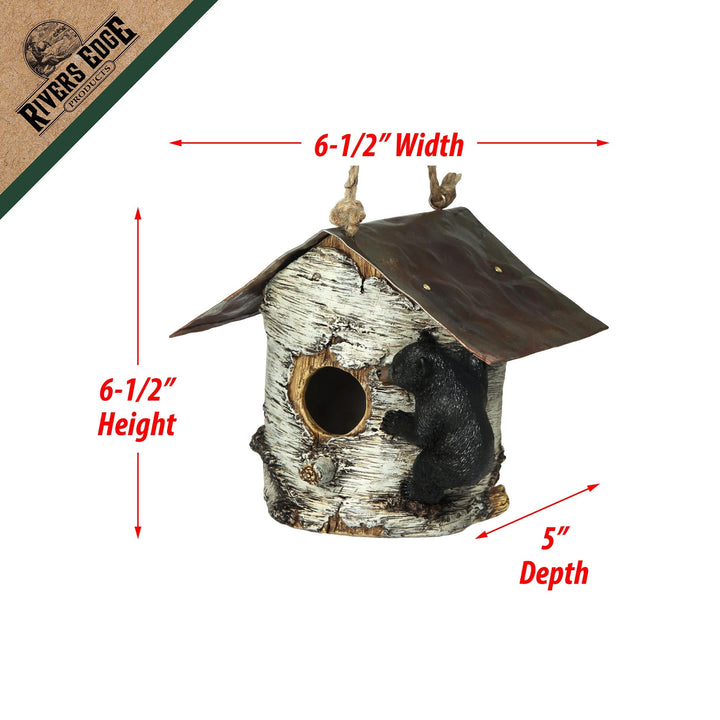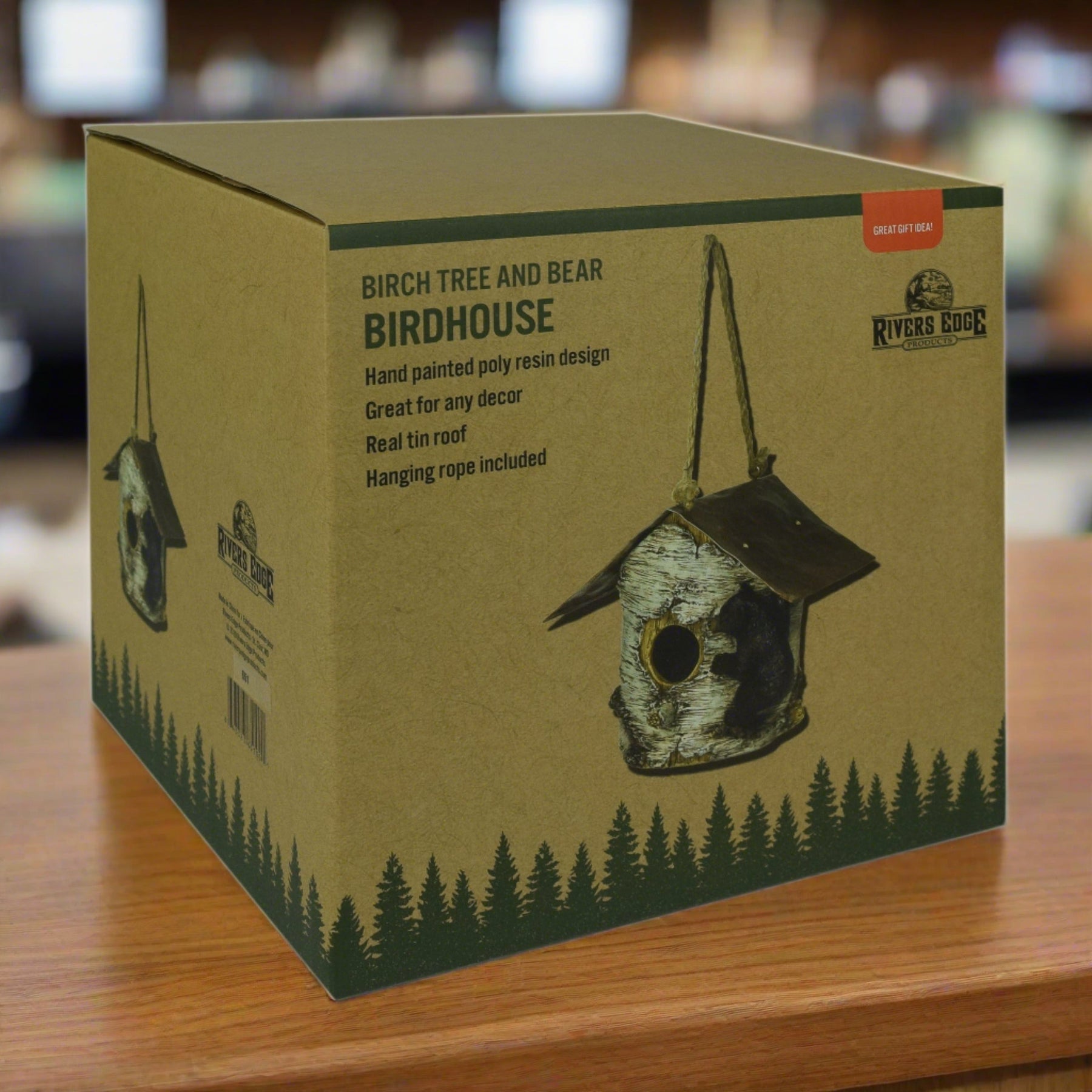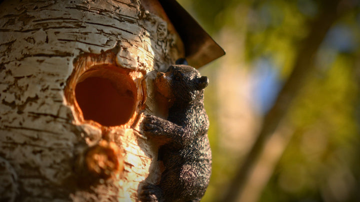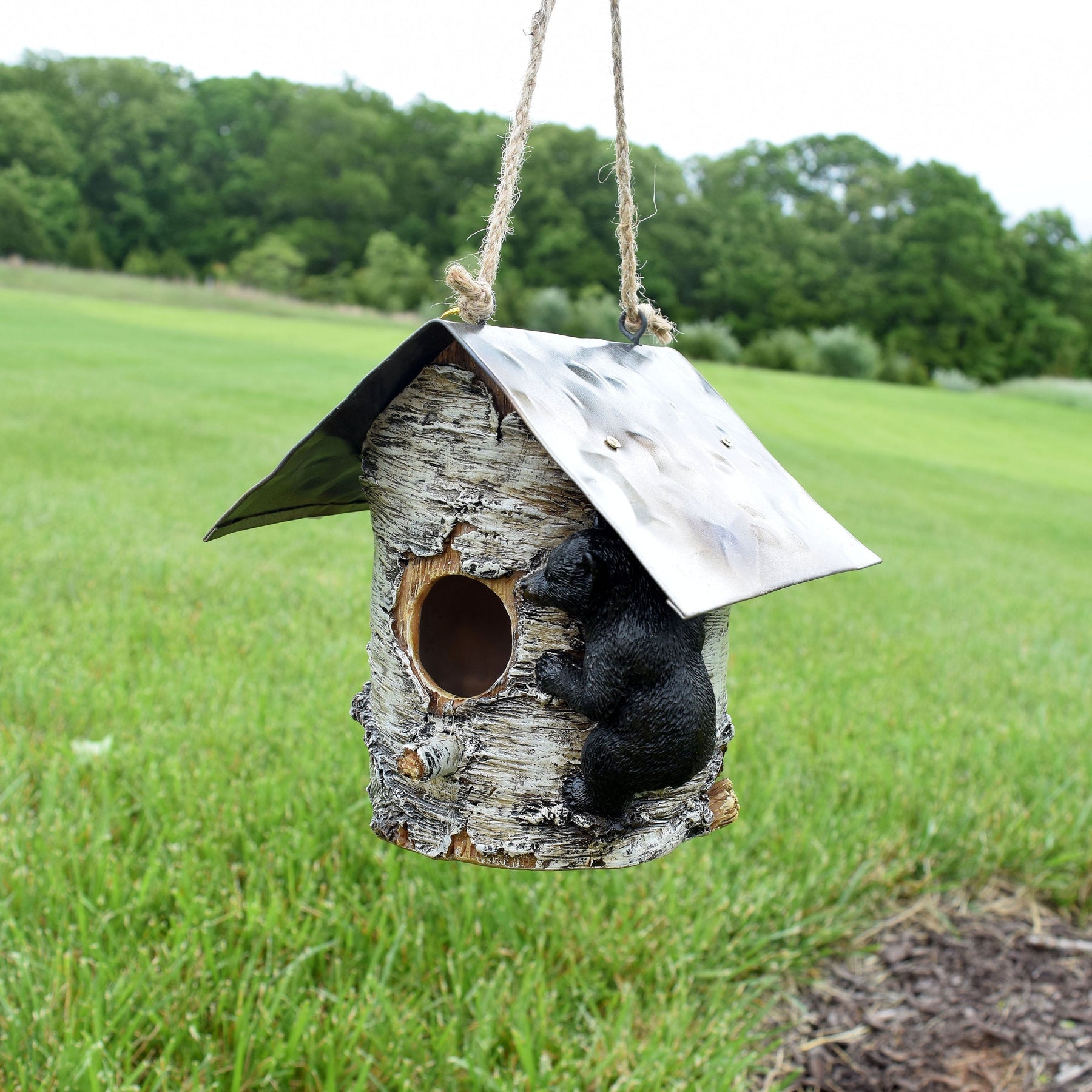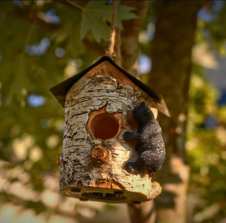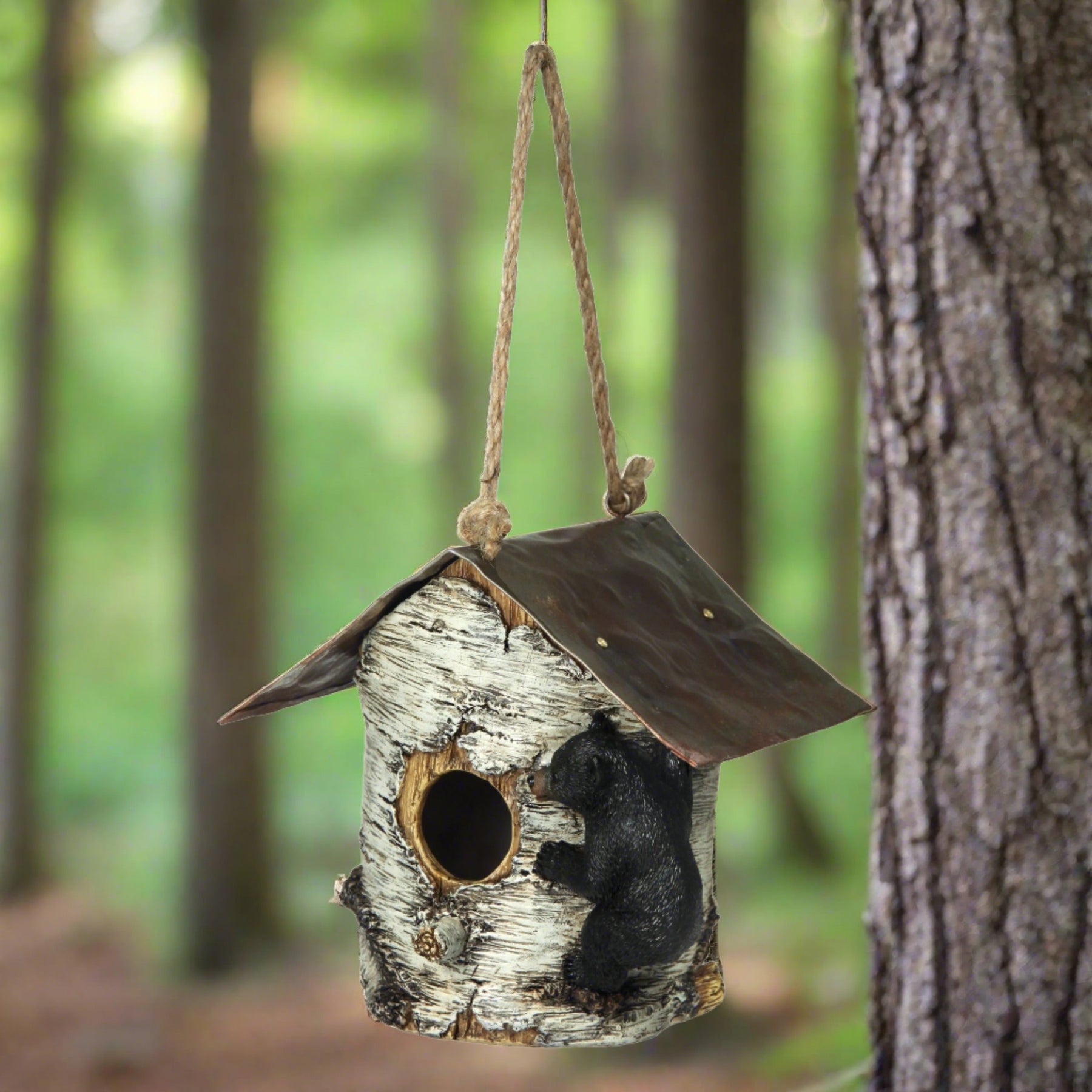 Enhance your garden with this hanging birdhouse, featuring a charming birch tree and bear design that brings a touch of forest magic to your outdoor space.